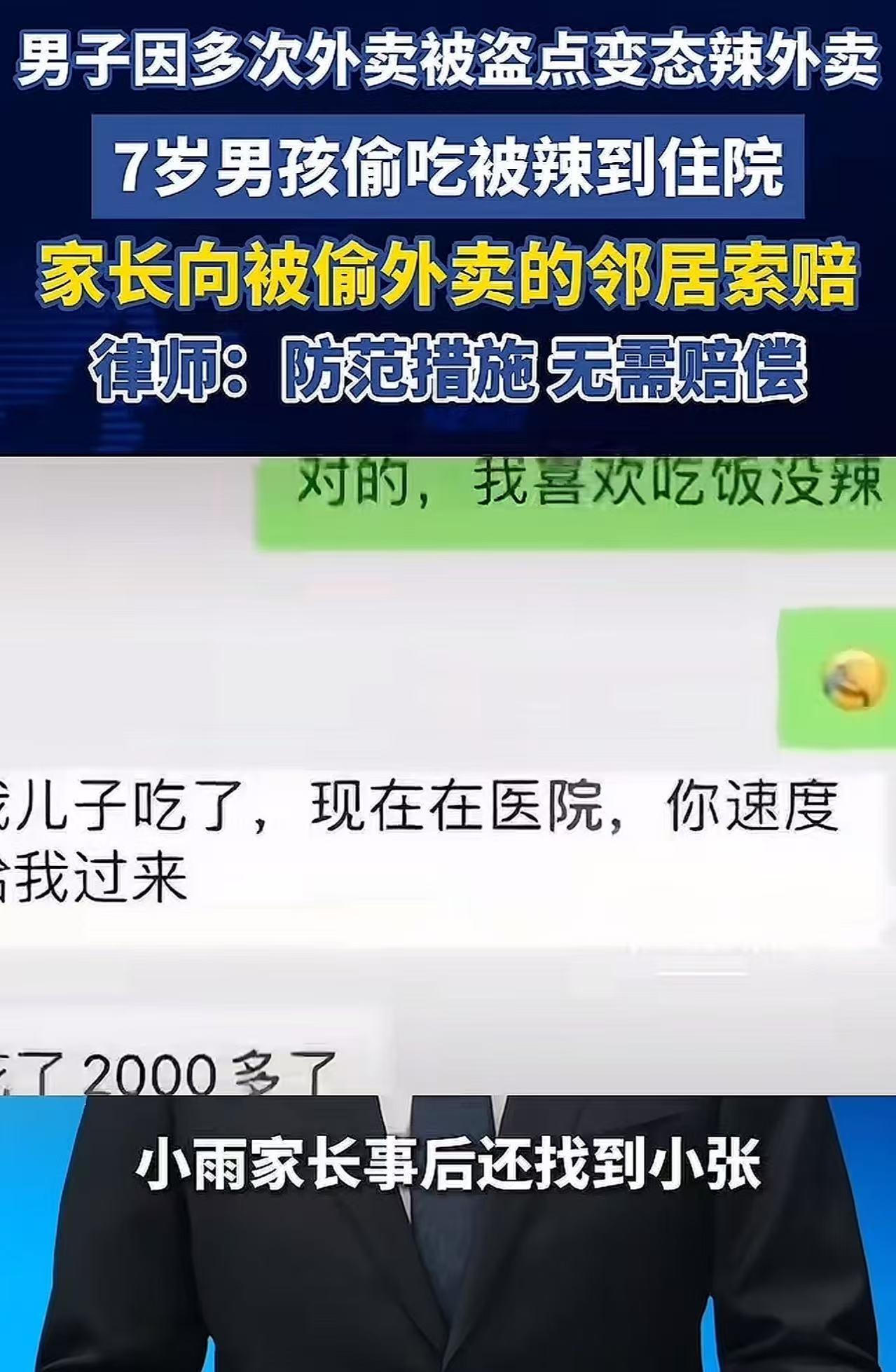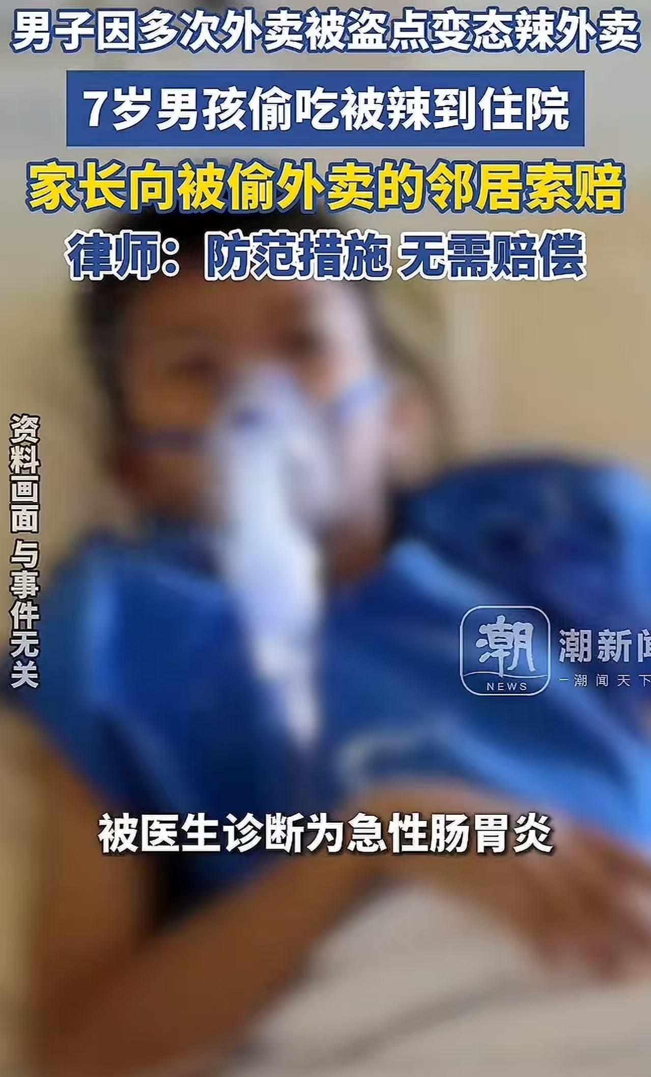 7岁男孩偷吃邻居“变态辣”外卖后住院,出现剧烈腹痛、呕吐等症状!家长向外卖主人索赔!网友:这种家长怎么好意思的,自己孩子偷窃还状告失主? 小张每天下班都回提前点外卖,这样到家就可以马上吃上外卖。可让他郁闷的是,他多次遭遇外卖丢失的情况,这让他又气又恼。 为了教训一下这个偷拿自己外卖的人,小张灵机一动,特意点了一份号称“变态辣”的外卖。 他心想,这次要是那个偷外卖的人还敢来,尝到这变态辣的滋味,估计以后就不敢再偷了。 但是,小张怎么也没想到,偷吃他外卖的却是年仅七岁的小雨。 小雨是个小吃货,每次看到小张家门口有外卖,就觉得是自己捡到,拿过来就直接开吃。 这天,小雨又像往常一样,偷偷地将外卖取走,找了个角落迫不及待地打开吃了起来。 但小雨吃下一口,就感觉肚子里像有一团火在燃烧,剧烈的腹痛如潮水般袭来,疼得他在地上直打滚。 紧接着,一阵恶心涌上心头,他开始不停地呕吐,整个人瞬间变得虚弱不堪。 小雨的异常情况很快被家人发现,急忙将他送往医院。经过医生的详细诊断,小雨被确诊为急性肠胃炎,需要住院治疗。 这一住就是好几天,各种检查、治疗费用加起来,花了两千余元。 看着病床上痛苦不堪的小雨,还有那一张张不断累积的医疗费用单据,小雨的家长心疼不已,同时也气愤难平。 他们觉得小张存在过错,认为小张故意点那么辣的外卖,这才导致小雨吃了之后生病住院。 于是,小雨的父母找到小张,理直气壮地要求小张赔偿医疗费、护理费等各项费用。 小张面对小雨家长的索赔要求,感到十分委屈和无奈。他满脸无辜地表示,这份外卖是自己合法购买的,自己有权利选择吃什么口味的外卖。而且小雨是偷偷拿走并食用了他的外卖,这是偷窃行为,怎么能要求自己赔偿? 双方各执一词,小雨父母决定走法律途径解决。 此事引发热议,有网友说,虽然大家都在说小孩活该,但是从法律角度说,大概率,这个人要负责。没办法的,就和行人闯红灯被撞死一样,多少都要赔偿。 也有网友说,咱要是孩子家长,咱都不敢好意思,自己教育出的东西,自己负责! 还有网友说,这肯定要赔偿!如果外卖里加了毒药呢?明知预期到小孩会偷拿,会不会存在故意谋杀? 那么,从法律上来说,小张需要赔偿吗? 小张点外卖是一种正常的民事活动,他既没有违反法律法规,也没有违背公序良俗。虽然小张点了变态辣外卖,并且也预见到外卖可能会被偷,但他点辣外卖的行为属于事先的防范措施,其目的是为了保护自己的合法权益不受侵害。 辣椒本身就是常见的调味品,小张并没有使用超出必要限度的手段,所以小张无需对小雨的住院损失承担赔偿责任。 在这起事件中,小雨家长的行为实在是荒谬至极。孩子偷拿他人财物本就是错误的行为,家长不仅没有正确引导孩子认识错误,反而将责任一味地推给他人,试图通过索赔来弥补自己的损失,这无疑是在纵容孩子的错误行为。 教育孩子树立正确的价值观和道德观,是家长义不容辞的责任。如果家长总是为孩子的错误行为找借口、推责任,那么孩子永远都无法认识到自己的错误,将来很可能会走上歧途。 同时,这也反映出部分家长缺乏基本的法律意识和责任意识,在面对问题时,不能理性地分析和处理,而是采取无理取闹的方式。社会需要的是有担当、有责任感的公民,而不是一味推卸责任的人。 希望这起事件能给广大家长敲响警钟,重视孩子的教育,树立正确的责任观念,否则,最终受害的将是孩子自己。 (案例来源:九派快讯)