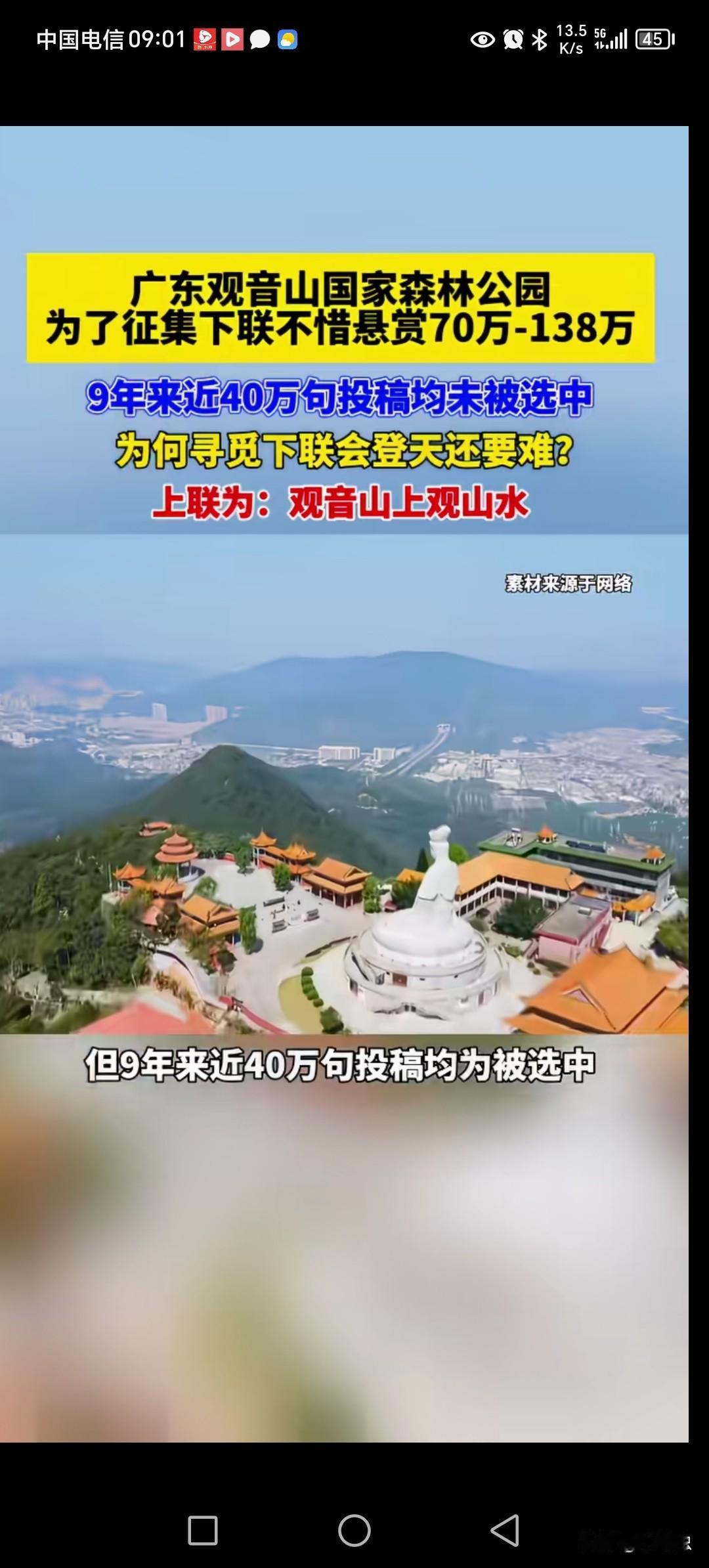 广东观音山,9年了,征下联无人能对的出。 近百万悬赏,无人能拿下。 全国投搞提联40万投搞,无一被选中。 被网友称为,再过几十年也无人能领。 存在吸引人,不上联的眼球忽悠人。 考卷都有年年都有状元郎。 为什么出题榜,9年无人得榜首。 是咱们智慧低,还是不愿意放榜给得联者。 这已经不是文字问题,而是游戏问题了。