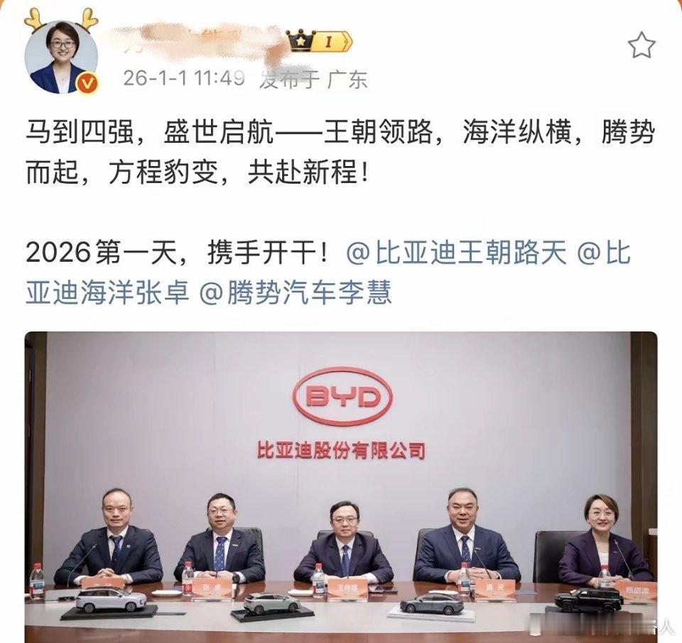 比亚迪:2026第一天,携手开干!今天是2026年的第一天,王传福就带着大家一起更新了他们的动态!今天中午,比亚迪的熊甜波,率先在社交网络发了一张图片,图片当中,王传福坐在中间,带着各个品牌的负责人,大家一起来了一张大合照。熊甜波这个文案也写得比较有特色,把每一个品牌的特点都表现出来了,他说:王朝领路,海洋纵横,腾势而起,方程豹变,共赴新程!该说不说,这文采还是挺在线的。2025年他们的任务妥妥完成了,不管是交付量还是销量,都交出了不错的答卷。2026年,他们说不定能搞出些新突破。到目前为止,品牌去年的成绩总结和详细数据还没公布,说不定过会儿就发了,咱们等着瞧。