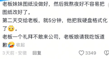 老板妹妹图纸没做好,然后我熬夜好不容易把图纸改好了。第二天交给老板,就5分钟,他把我硬盘格式化了,老板一个礼拜不敢来公司,老板娘请我吃饭道歉