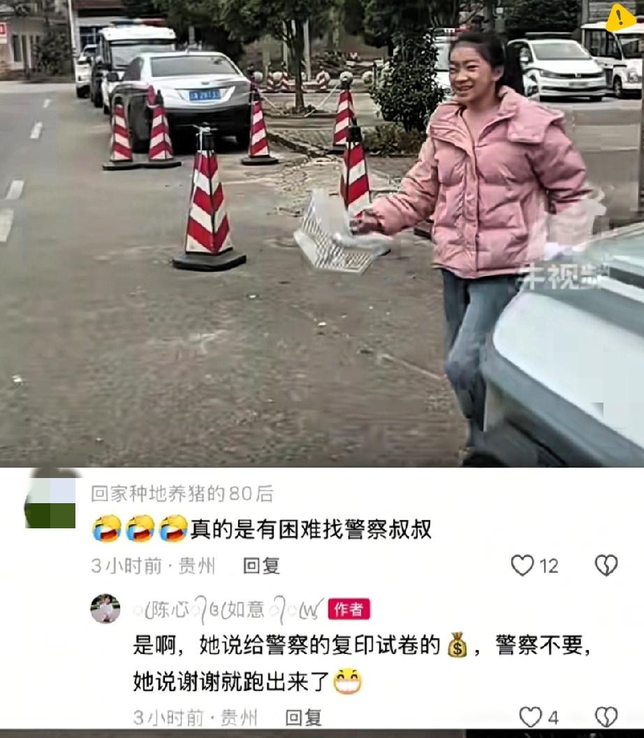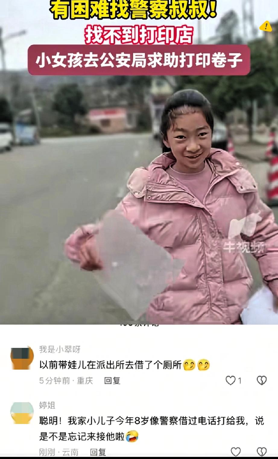 好大的胆子! 谁能想到,一个看着斯文腼腆的小姑娘,竟敢找帽子叔叔帮忙免费打印复习试卷,把妈妈都惊得不行! 眼看街上广告店全关门,明天试卷就得交,小姑娘没慌神,直接奔向派出所求助。 妈妈紧张得把车停老远,心里直打鼓,可也只能让孩子放手一试。 最后小姑娘笑着一蹦一跳出来,手里的试卷整整齐齐,妈妈悬着的心才算落了地。 这哪是“胆子大”,分明是孩子的纯真和勇气,撞上了工作人员的暖心与负责。 很多人遇事总觉得“麻烦别人不好意思”,却忘了善意本就是双向的。 那些看似严肃的岗位里,藏着的全是温柔的烟火气。 生活里你有没有过这种“大胆求助,意外被暖到”的经历?