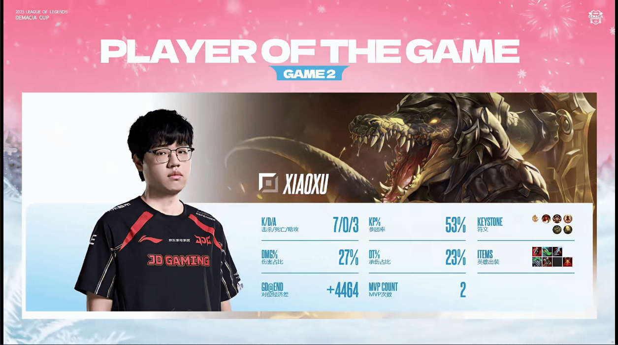 Xiaoxu鳄鱼打出7/0/3战绩,斩获JDG对阵LGD第二局MVP