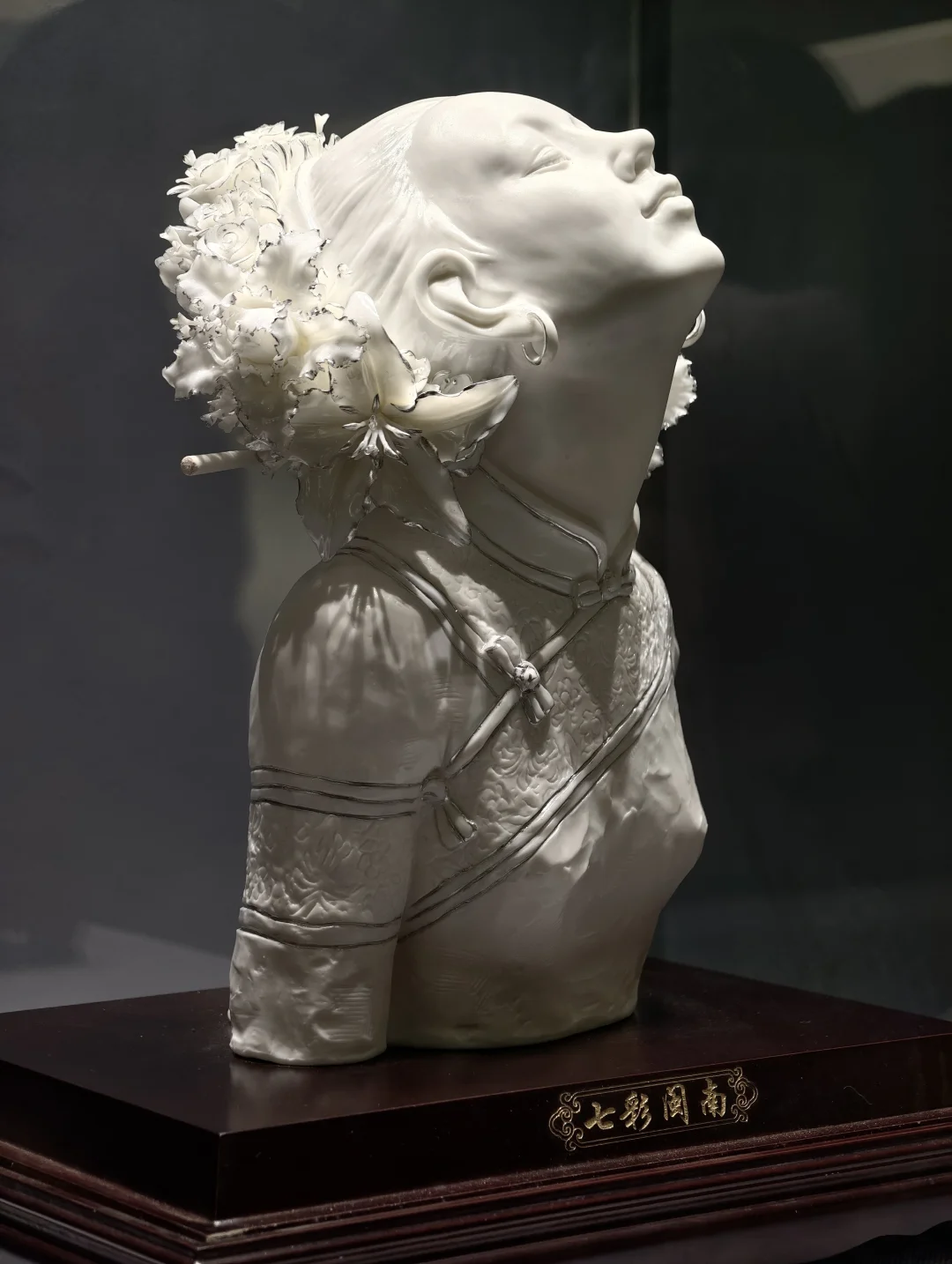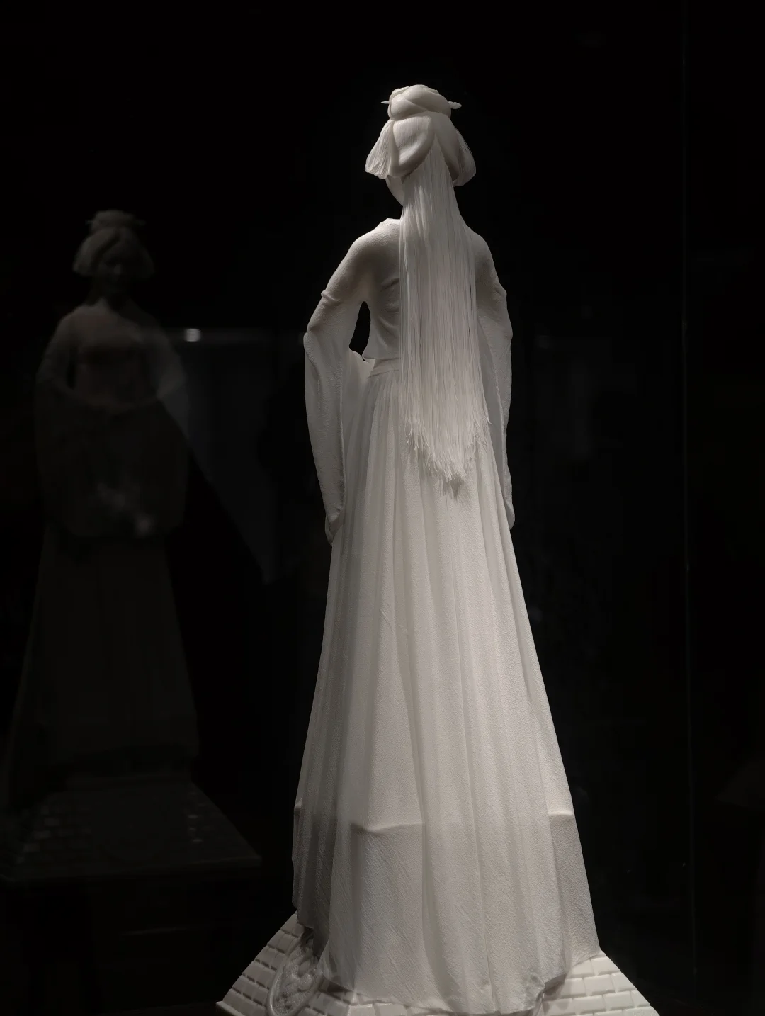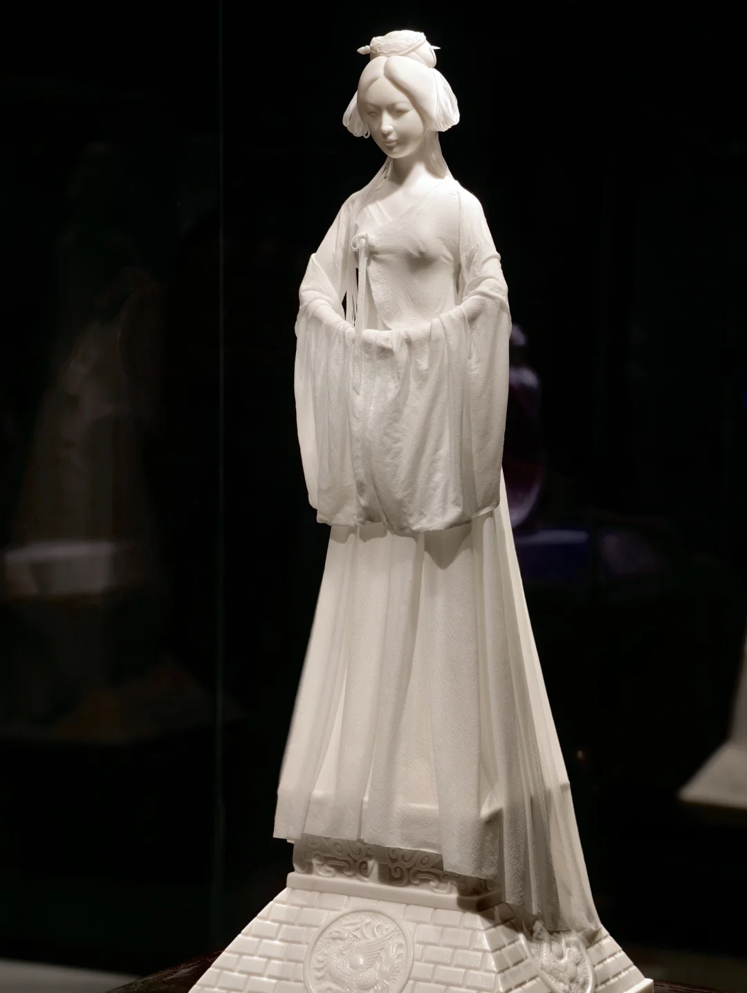 以《神话》中玉漱公主为原型创作,运用“高韧薄胎瓷衣技艺”,瓷衣厚度仅0.2毫米,呈现薄如鲜翼、飘逸如风的效果。太精致,太美啦
