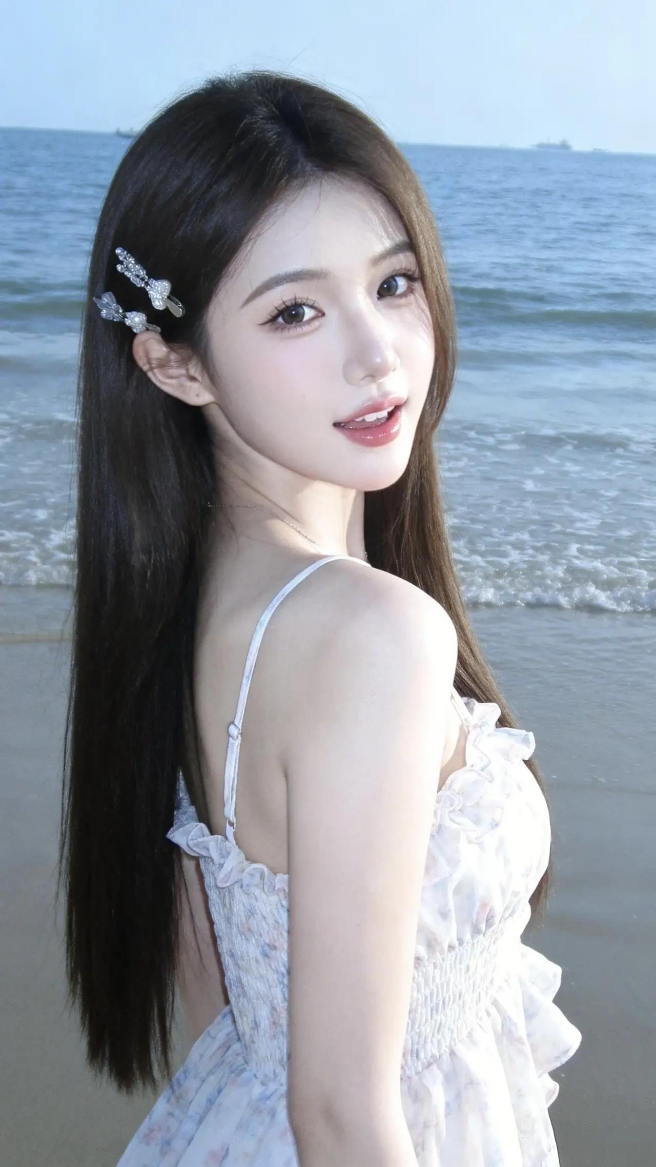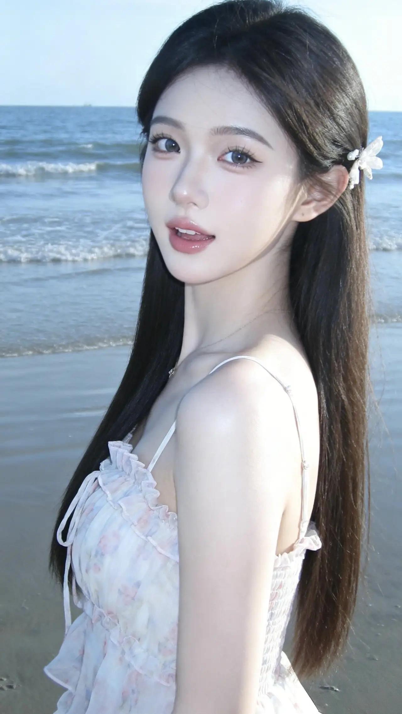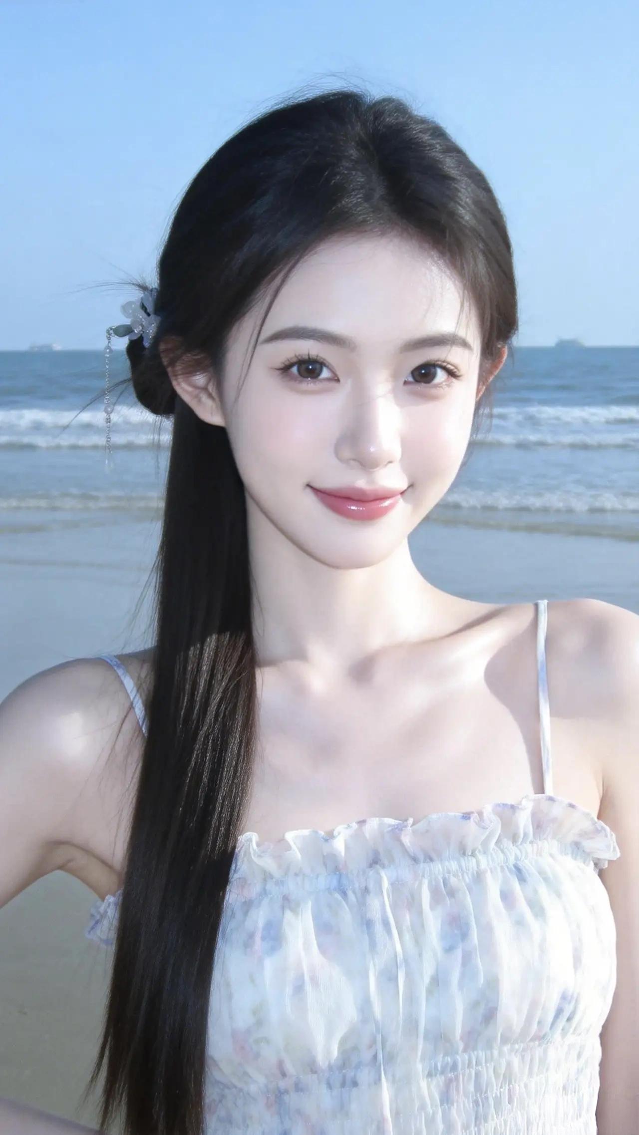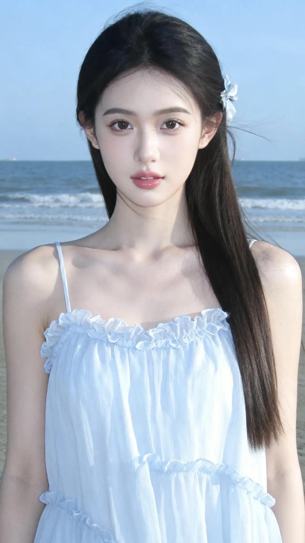 女子留着乌黑柔顺的长发,发丝自然垂落肩背,一侧发间别着一朵淡雅的白色花朵发饰,为整体造型增添了几分柔美与浪漫。她面容清秀,眉眼明亮,眼神清澈而温柔,直视镜头,仿佛与观者进行无声的交流。妆容自然清新,粉嫩的唇色衬托出健康光泽的肌肤,尽显青春活力。 她身穿一件浅蓝色吊带连衣裙,裙装采用轻薄透明的雪纺材质,肩带纤细,领口和胸部装饰着精致的荷叶边,增添了几分甜美与灵动。裙摆在海风中似乎微微飘动,与背景的海浪呼应,整体造型清新脱俗,宛若海边的精灵。 构图上,人物居于画面中央,背景的海天一色为人物提供了简洁而富有意境的衬托,色彩以蓝白为主调,和谐统一,传递出夏日海边的宁静与美好。整体画面不仅展现了人物的清丽容颜与优雅气质,也完美捕捉了海滨度假的悠闲与浪漫氛围。