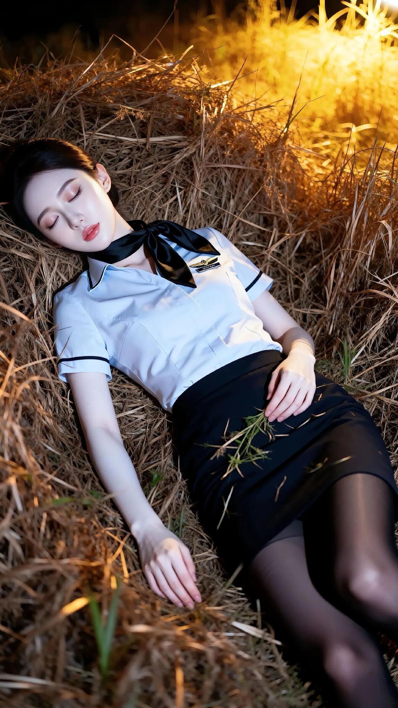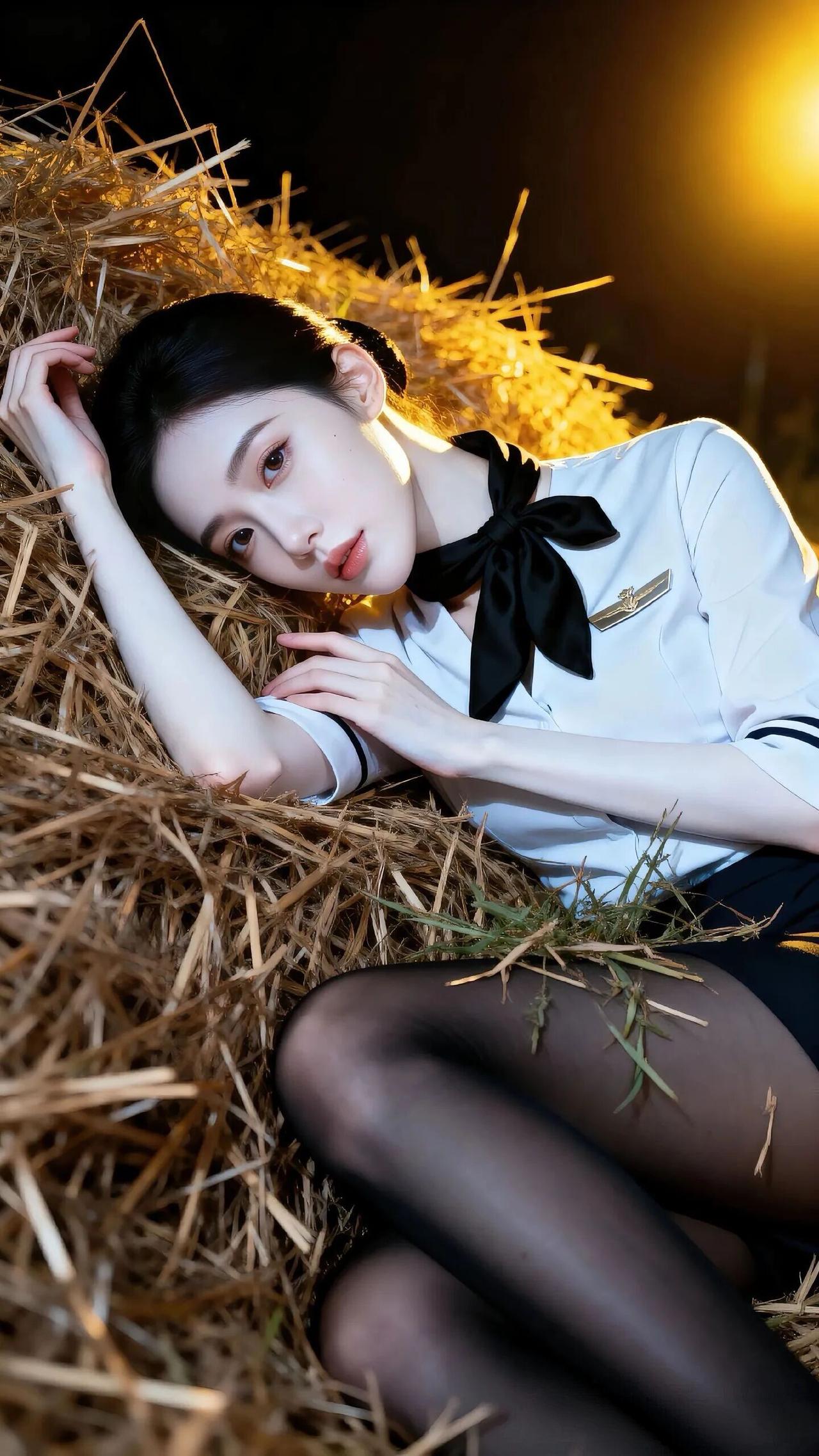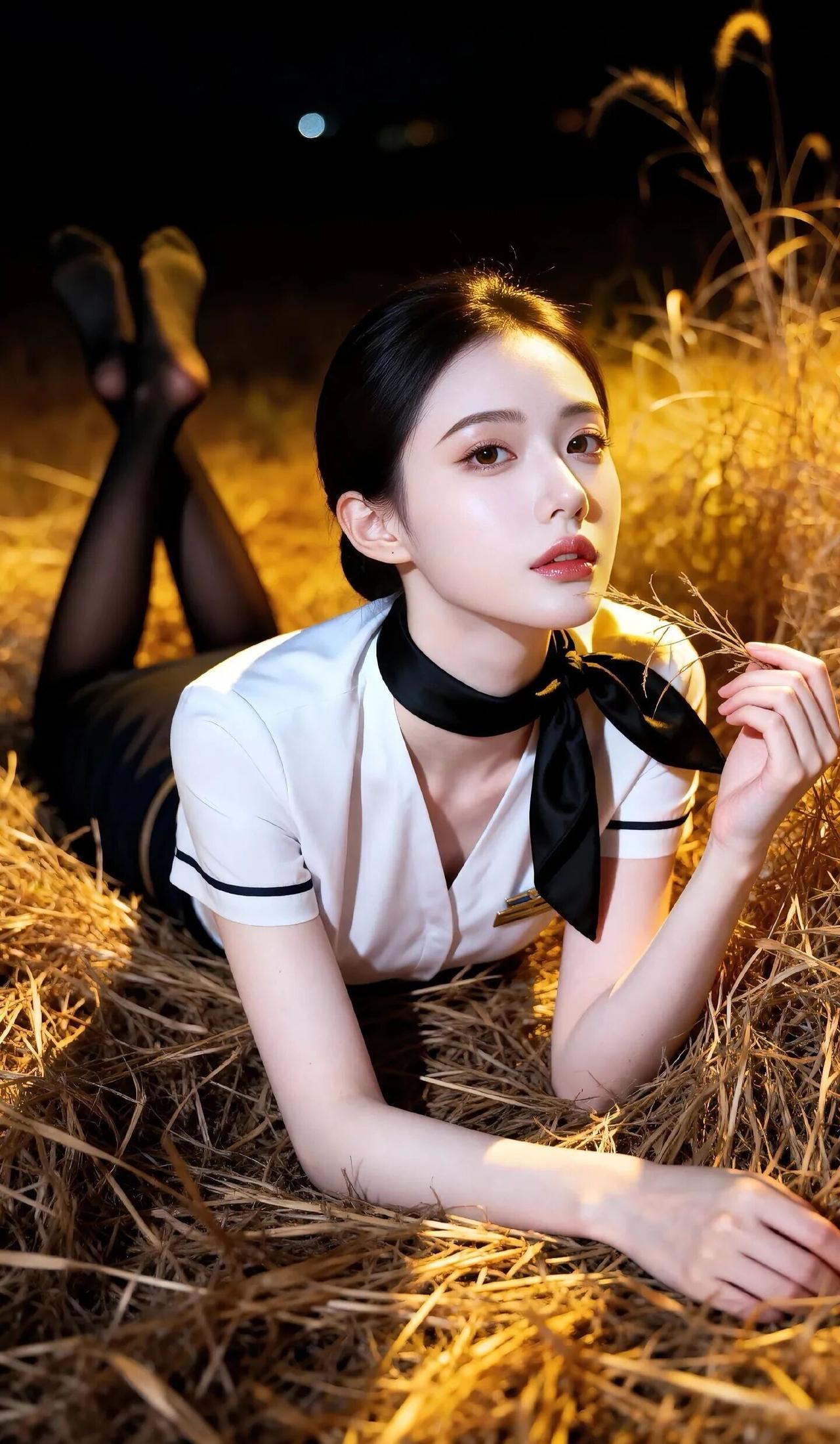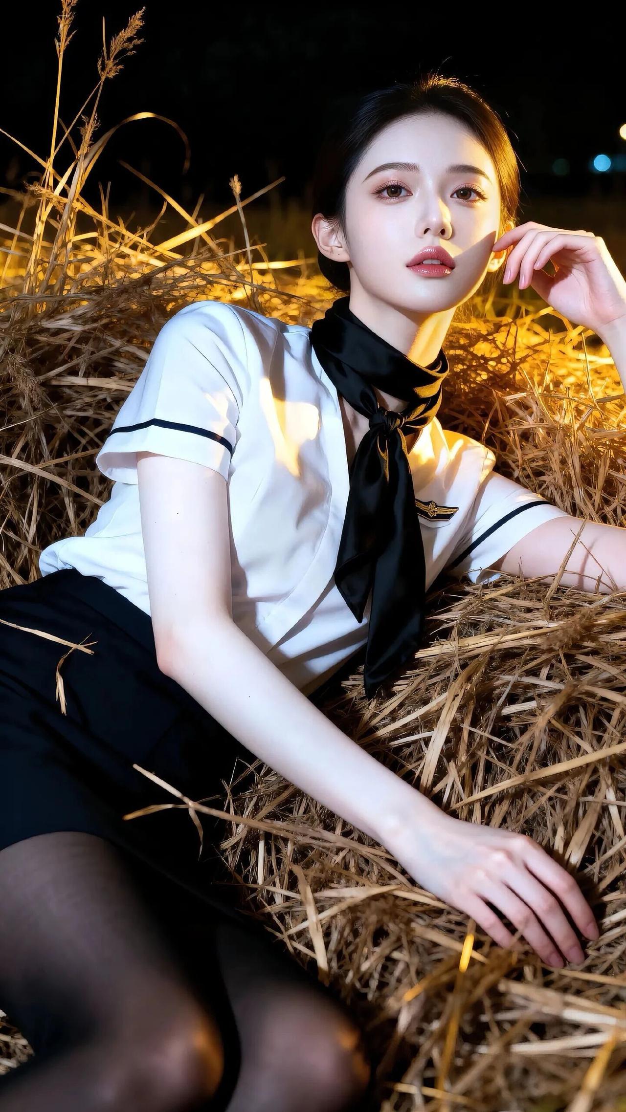 她姿态放松却又不失妩媚,一手持丝袜,一手轻扶腿部,动作自然流畅,仿佛在夜色中独享片刻私密。背景是漆黑的夜空,唯有灯光照亮周身,草垛的纹理与细碎植物在光影中若隐若现,烘托出孤寂又迷离的氛围。整体画面以黑白为主色调,灯光的暖黄点缀其间,制服的干练与夜色的柔媚交织,营造出强烈的视觉反差,传递出一种独特而暧昧的情绪。
