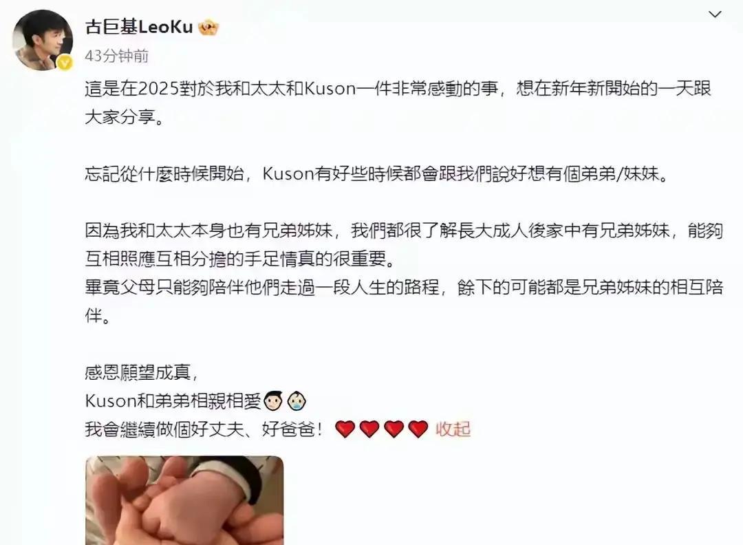 57岁生娃,她真敢赌命 古巨基晒二胎脚丫照,53岁再当爸,妻子57岁。评论区炸了:这岁数还能生? 港大医学院最新数据:50岁以上女性试管成功率从十年前的1%升到6%。听着高,背后是每天扎针、取卵、保胎,一针下去就是几百块。 陈韵晴能成,靠的是三件事:钱、命、命。一次试管疗程八万起步,三次打底;子宫环境、血压、血糖全得过关;最后还得老天给运气。 林心如说不敢追二胎,不是怕疼,是怕孩子十岁自己七十。这账谁都算得清。 高龄产子不是奇迹,是科技与钱包的拔河。你羡慕之前,先摸摸银行卡和体检报告。