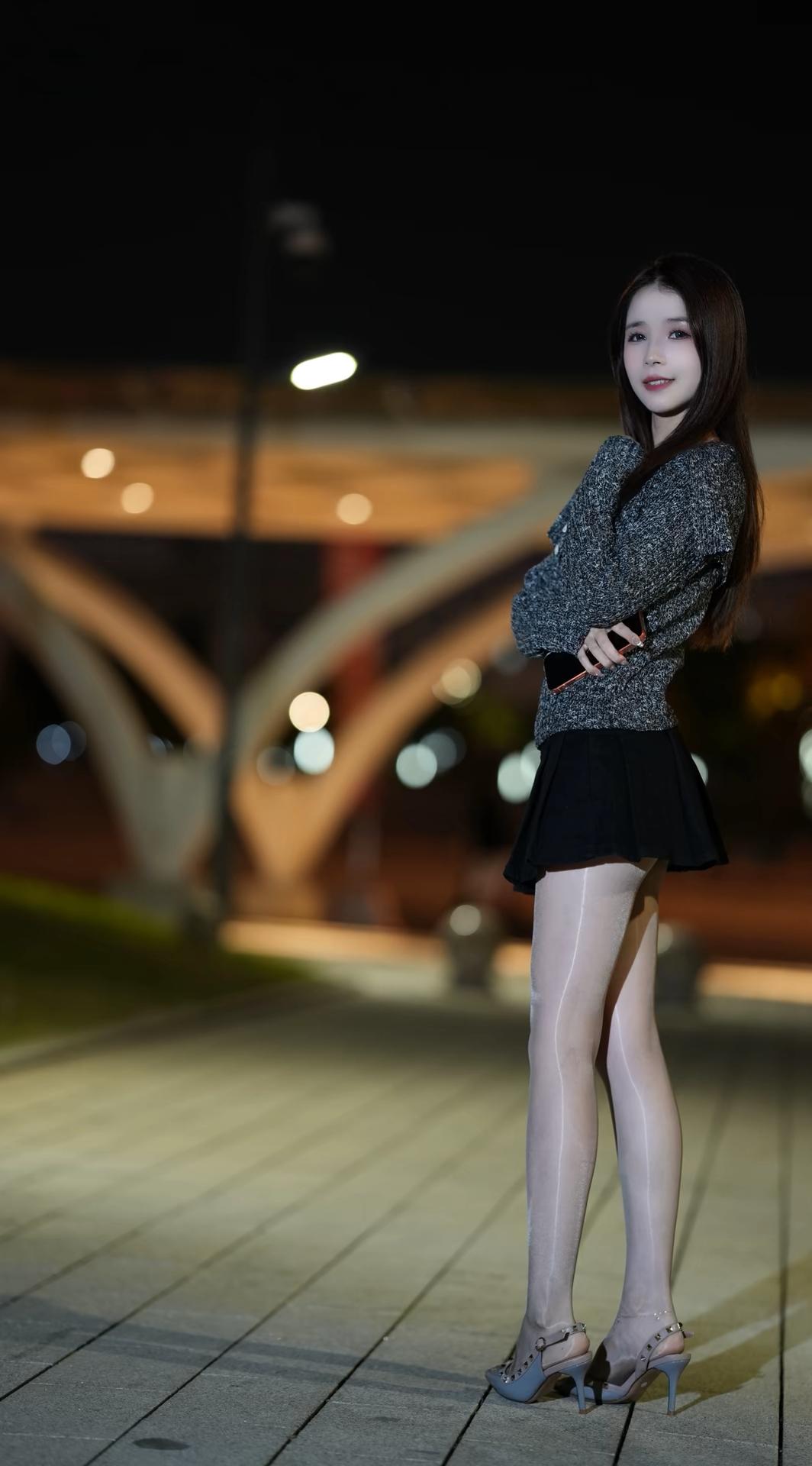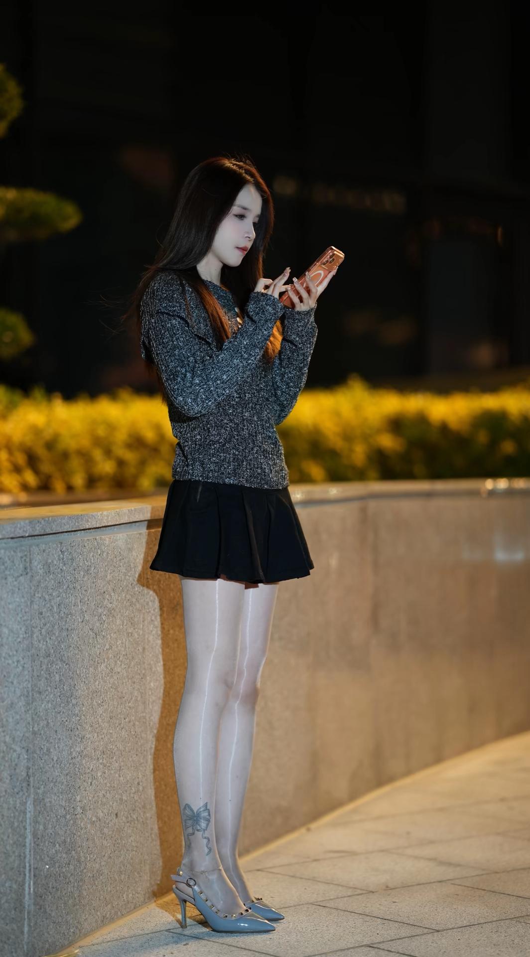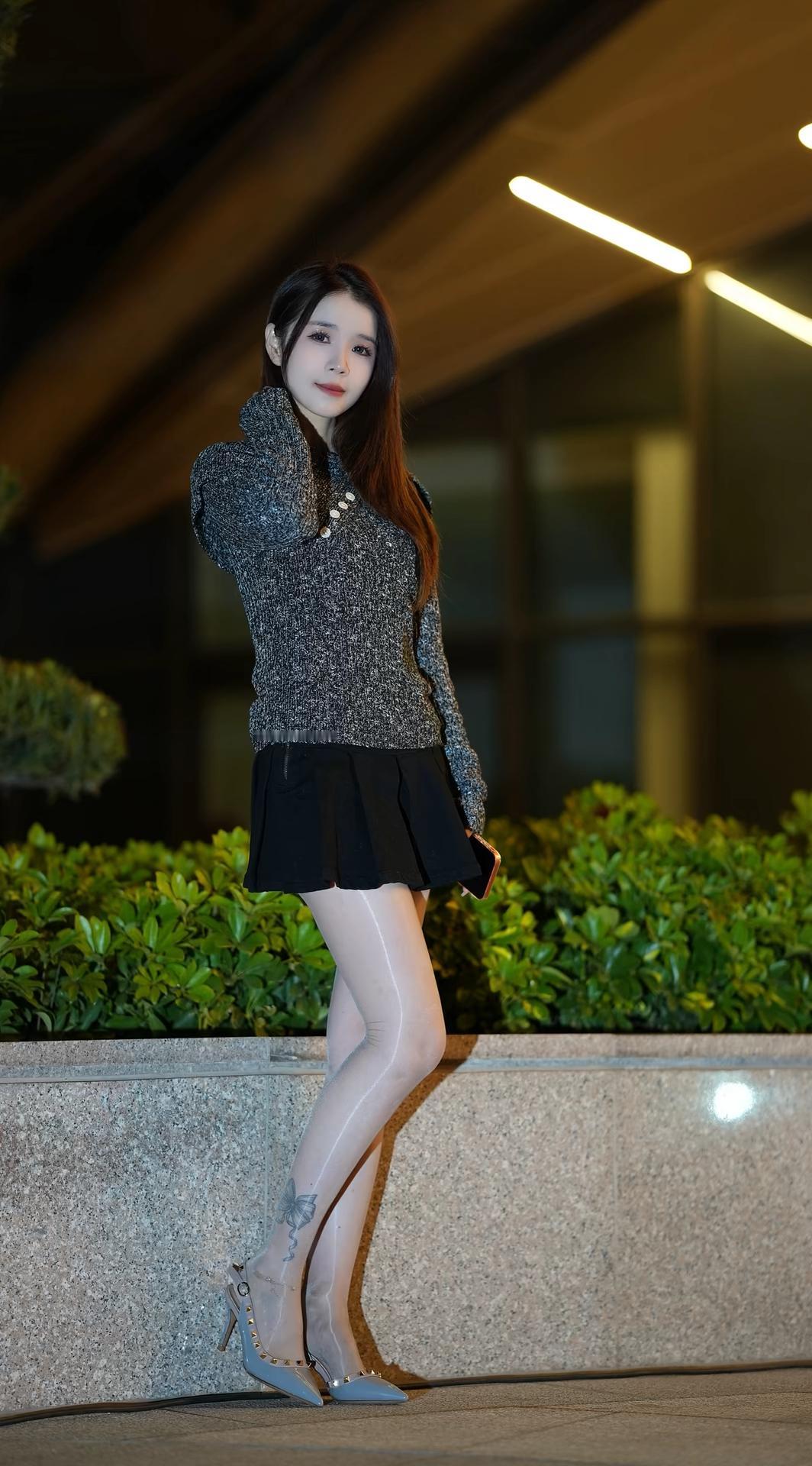 画面中,一位年轻女性立于夜晚的户外场景。她留着一头柔顺的棕色长发,发丝自然垂落在肩头,面容姣好,妆容精致,眼神温和地望向镜头。 她上身穿着一件灰色的针织毛衣,毛衣带有细密的杂色纹理,袖口微微收紧,肩部及胸前点缀着几颗白色圆形装饰,增添了几分俏皮与精致感。下身搭配一条黑色的百褶迷你裙,裙摆短俏,衬得双腿修长。她双腿穿着肉色的透明丝袜,隐约可见腿部线条,脚上蹬着一双浅灰色的高跟凉鞋,鞋面带有铆钉装饰和扣带设计,鞋跟细高,显得优雅又时尚。右手自然下垂,左手握着一部手机,姿态放松。 背景是一处现代都市的夜景,身后是修剪整齐的绿色灌木丛,下方是灰色的大理石矮墙,墙面光滑,反射着微弱的光线。上方是建筑物的屋檐,几盏长条形的暖色灯光照亮了场景,营造出温馨而现代的氛围。整体画面色调柔和,光线与阴影交织,展现出都市夜晚的时尚与优雅。