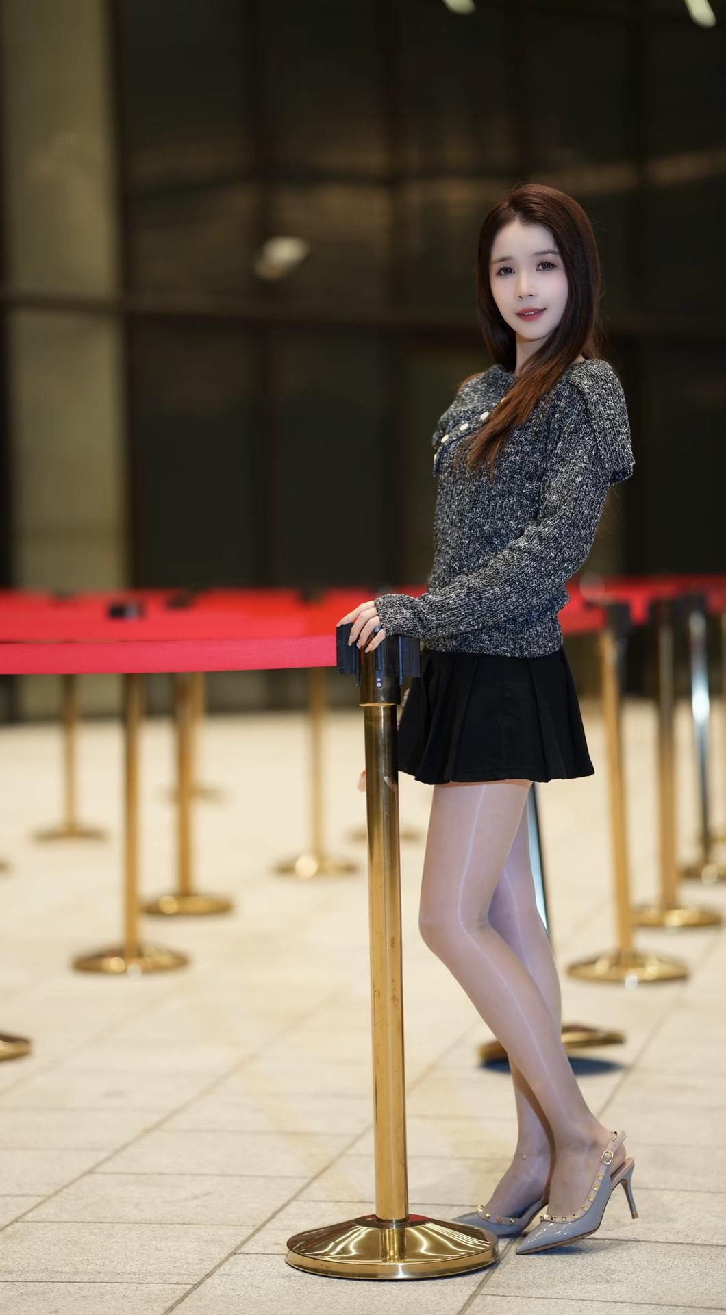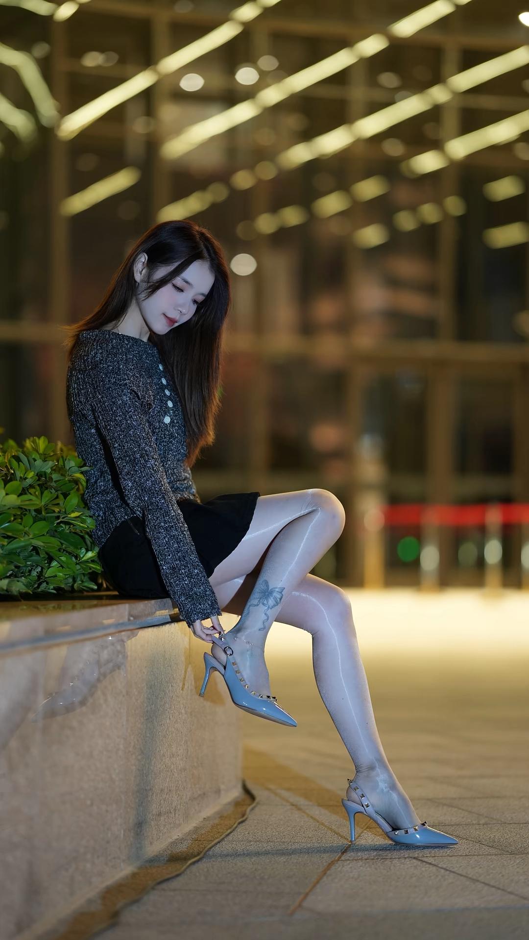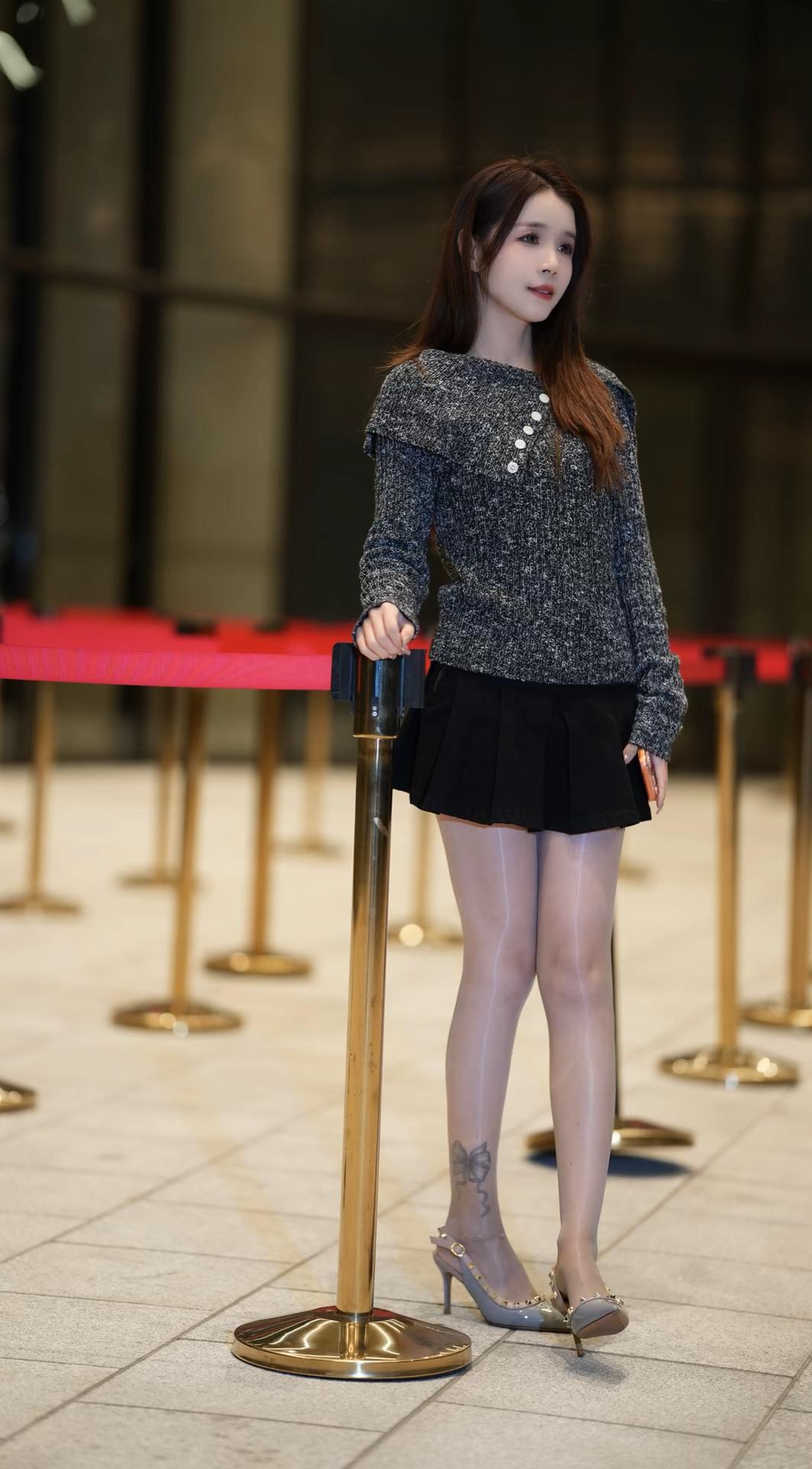 画面中,一位年轻女性立于夜晚的户外场景。她留着一头柔顺的棕色长发,发丝自然垂落在肩头,面容姣好,妆容精致,眼神温和地望向镜头。 她上身穿着一件灰色的针织毛衣,毛衣带有细密的杂色纹理,袖口微微收紧,肩部及胸前点缀着几颗白色圆形装饰,增添了几分俏皮与精致感。下身搭配一条黑色的百褶迷你裙,裙摆短俏,衬得双腿修长。她双腿穿着肉色的透明丝袜,隐约可见腿部线条,脚上蹬着一双浅灰色的高跟凉鞋,鞋面带有铆钉装饰和扣带设计,鞋跟细高,显得优雅又时尚。右手自然下垂,左手握着一部手机,姿态放松。 背景是一处现代都市的夜景,身后是修剪整齐的绿色灌木丛,下方是灰色的大理石矮墙,墙面光滑,反射着微弱的光线。上方是建筑物的屋檐,几盏长条形的暖色灯光照亮了场景,营造出温馨而现代的氛围。整体画面色调柔和,光线与阴影交织,展现出都市夜晚的时尚与优雅。