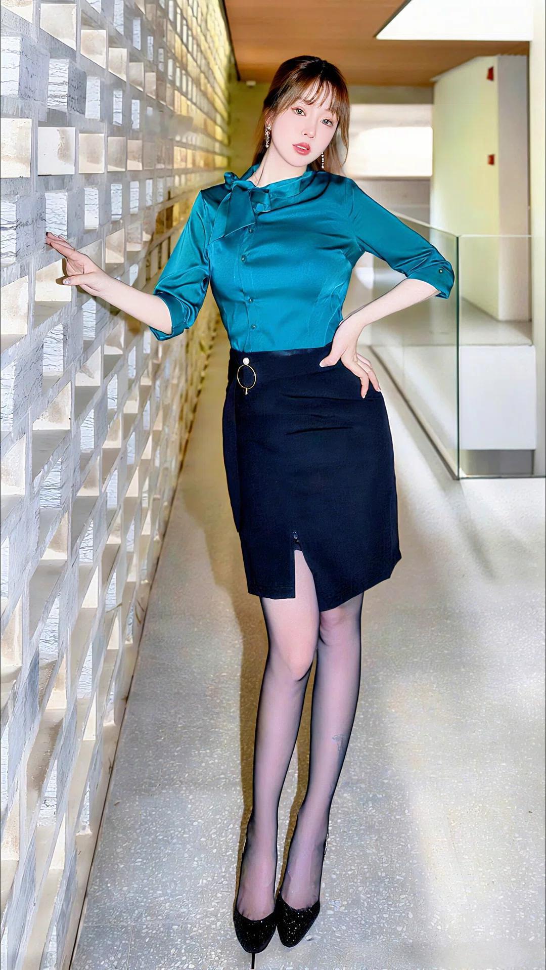 --- 画面中央是一位姿态优雅的年轻女性,她站在一条现代风格的室内走廊里。 **人物形象与穿着:** 她留着一头浅棕色的长发,额前是轻盈的刘海,发丝柔顺地披在肩后。她的妆容精致,红唇亮眼,眼神自信地望向镜头。耳朵上佩戴着一对闪亮的长款耳坠,为整体造型增添了几分华丽感。 她上身穿着一件墨绿色(或蓝绿色)的缎面衬衫。衬衫质感光滑,泛着柔和的光泽,领口设计尤为别致,采用了大翻领并系成一个宽大的蝴蝶结,非常具有设计感和女性柔美气质。袖子是七分袖,恰到好处地露出纤细的手腕。 下身搭配一条黑色的修身包臀裙。裙子长度到膝盖上方,紧贴身形,勾勒出优美的腰臀曲线。裙子的左侧下摆处有一个小小的开叉,增添了一丝性感与灵动。腰间系着一条黑色腰带,带有一个醒目的圆形金属环扣,成为视觉焦点。 她双腿穿着薄款的黑色透明丝袜,使腿部线条显得修长而光滑。脚上是一双经典的黑色尖头细高跟鞋,鞋面带有闪亮的亮片或水钻装饰,在光线下熠熠生辉,尽显成熟与性感。 **姿态与动作:** 她的姿势充满自信和女人味。右手伸出,纤细的手指轻轻搭在身旁的墙壁上;左手则自然地叉在腰间,手肘向外打开,这个姿势不仅展现了她纤细的腰肢,也让整个身体线条显得更加修长和富有动感。 **背景环境:** 她所处的环境是一条明亮、现代的走廊。 * **左侧**:是一面由透明或半透明玻璃砖砌成的墙体,玻璃砖呈方格状排列,内部似乎有波纹或杂质,在灯光下反射出斑驳的光影,极具设计感和通透感。 * **右侧**:是通透的玻璃栏杆,可以看到走廊外侧更明亮的空间,远处墙面呈淡黄色或米白色。 * **地面**:是浅灰色或米白色的水磨石地板,表面光滑洁净,反射着顶部的灯光和人物的倒影。 * **顶部**:可以看到嵌入式的长方形照明灯,提供了均匀明亮的光源。 整体光线充足、柔和,色调偏暖,营造出一种时尚、高级、现代且略带私密感的氛围。人物与环境完美融合,展现出一种都市女性的知性、优雅与性感魅力。