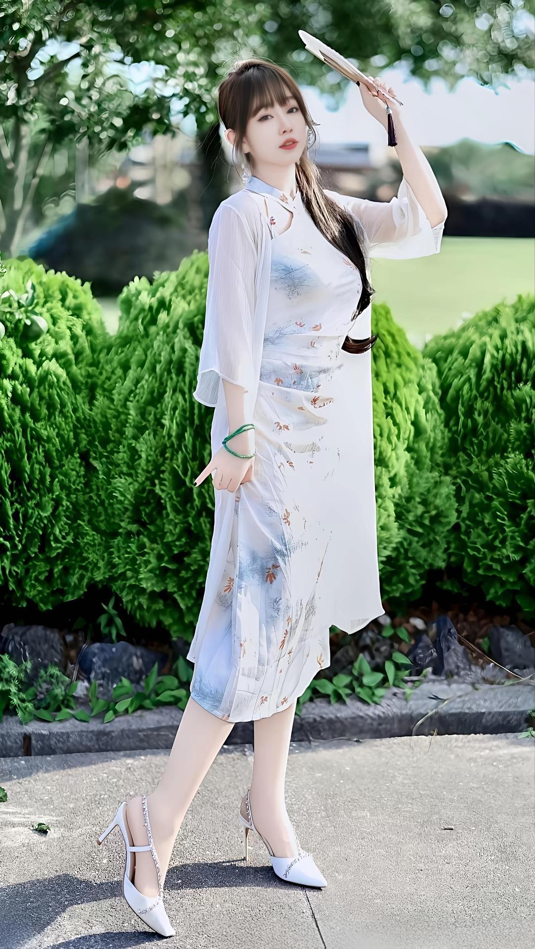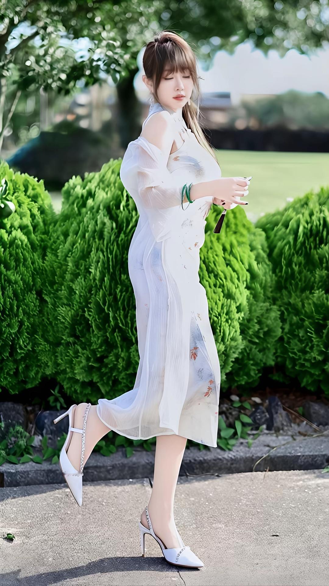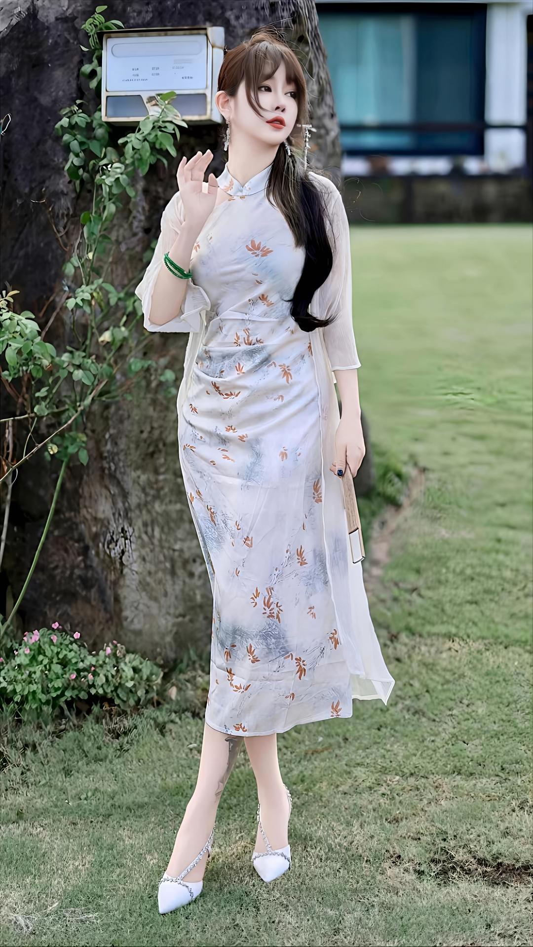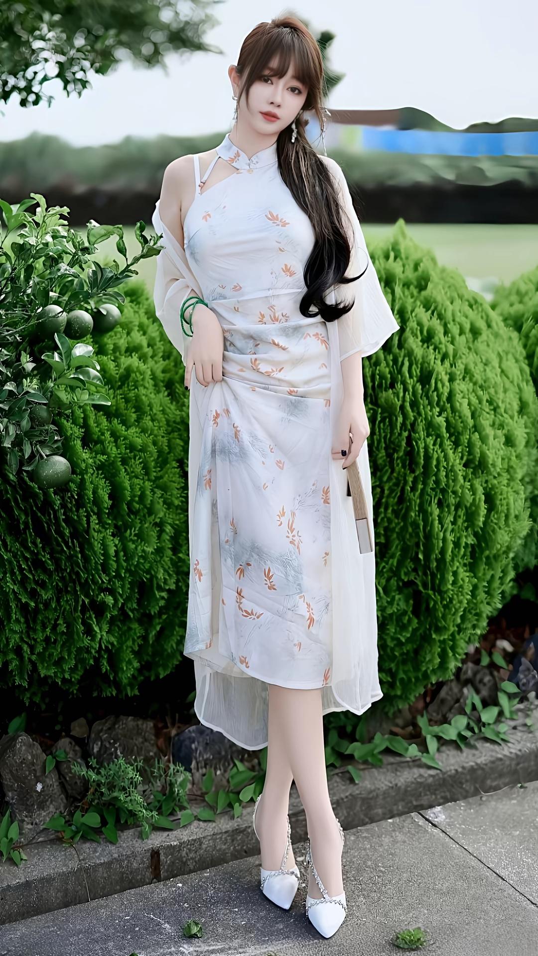 晒图笔记大赛画面中,一位女性立于户外绿植旁。她留着棕色长发,齐刘海修饰脸型,长发在脑后扎成马尾,发间点缀着精致的发饰。她身着一套浅色系旗袍套装:内搭为立领盘扣旗袍,底色清透,点缀着橙色花卉图案,修身剪裁勾勒出优雅曲线;外搭一件轻薄的白色纱质开衫,袖口宽松,增添柔美气质。配饰上,耳畔垂着一对长款珍珠耳坠,手腕戴着绿色珠串手链,指尖涂有黑色美甲。她的姿态优雅——右手高举,似轻触空中事物;左手握着一根木质手杖,自然垂于身侧。背景是户外场景,前景是繁茂的绿色植物(叶片间隐约可见青色果实),后方道路旁停着一辆深色汽车,远处建筑与绿植被虚化,整体氛围清新自然,光线柔和明亮,尽显温婉典雅的东方韵味。