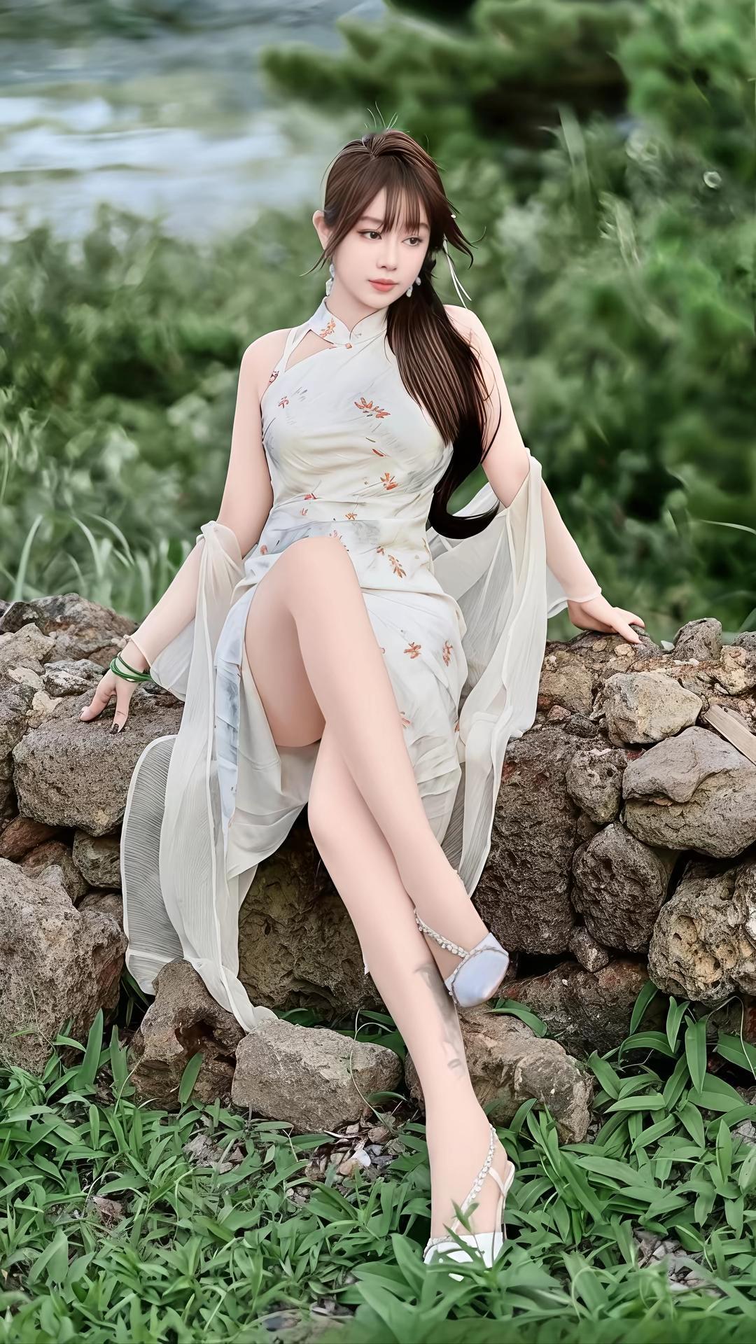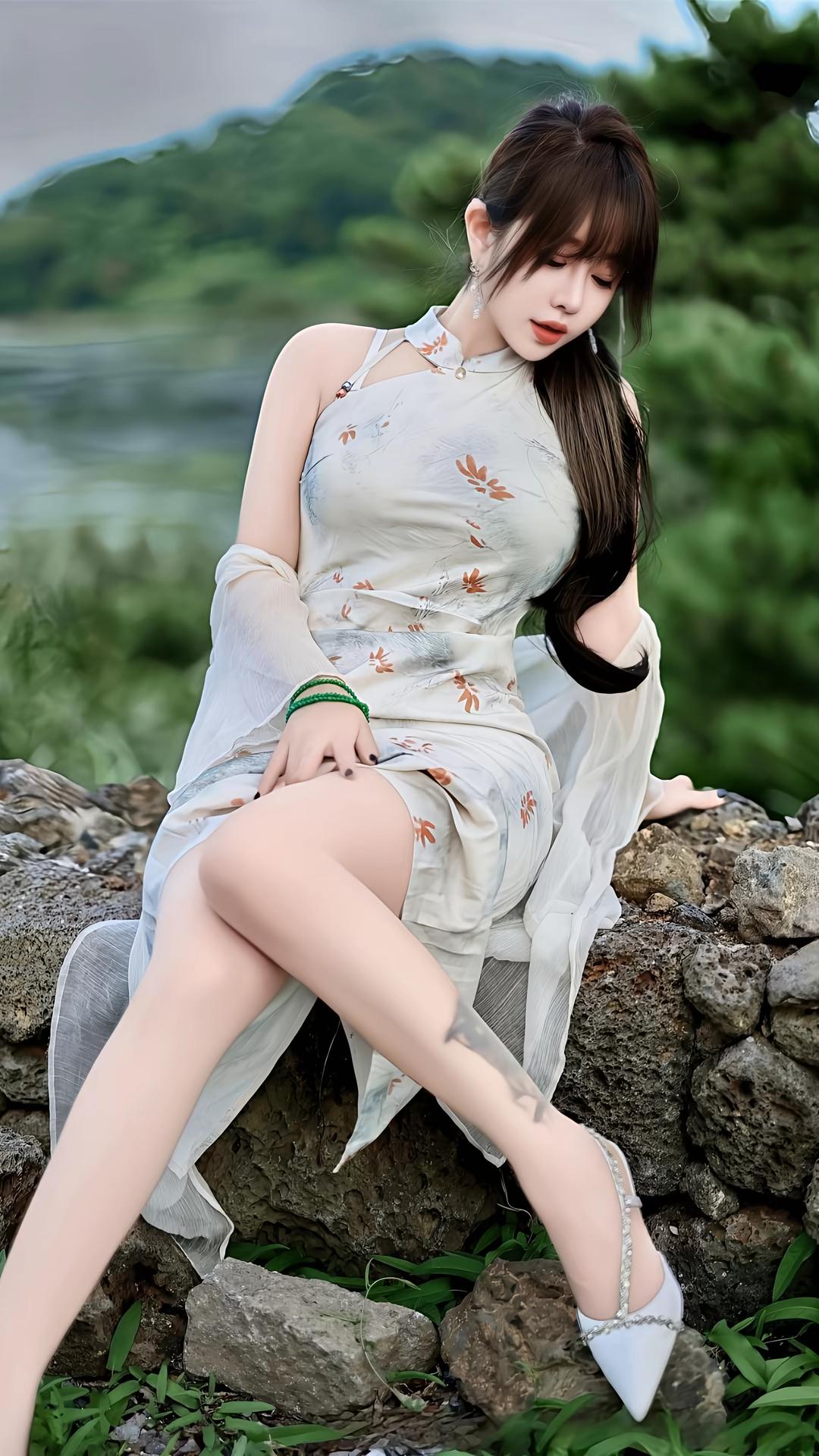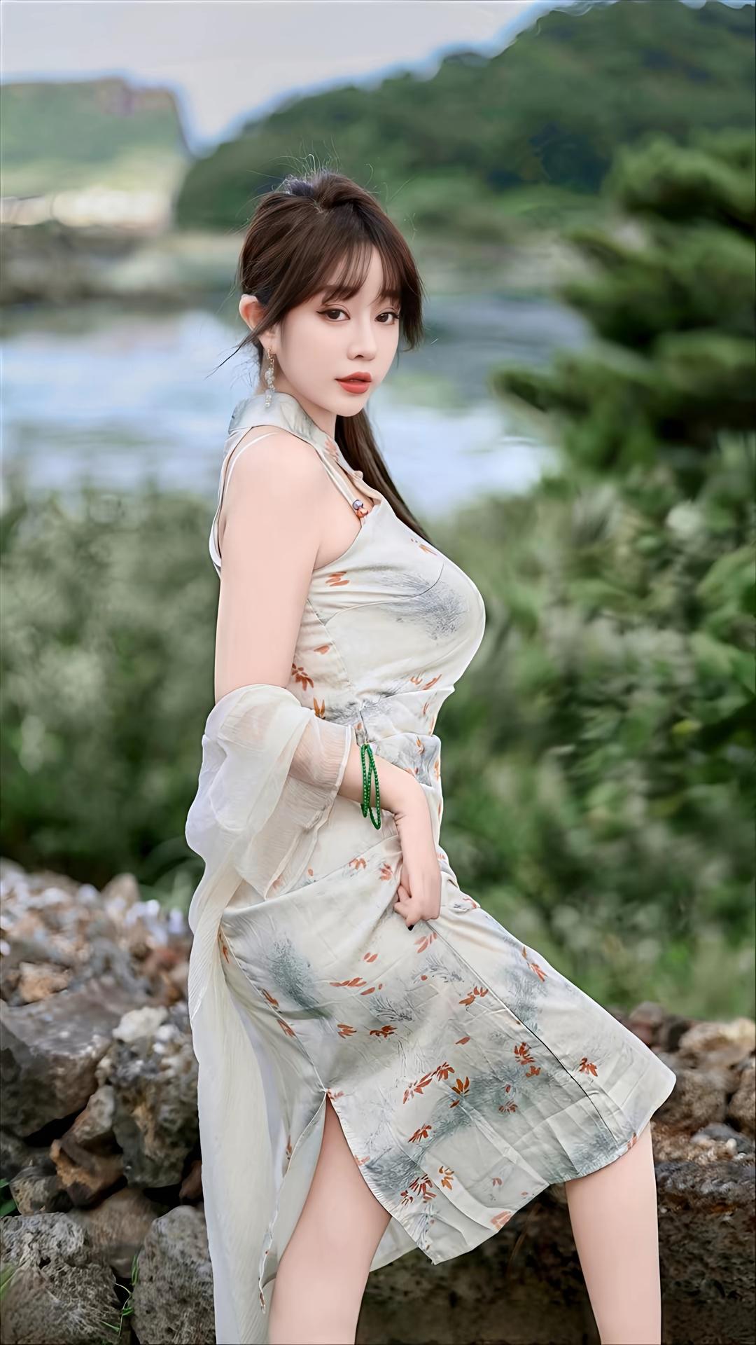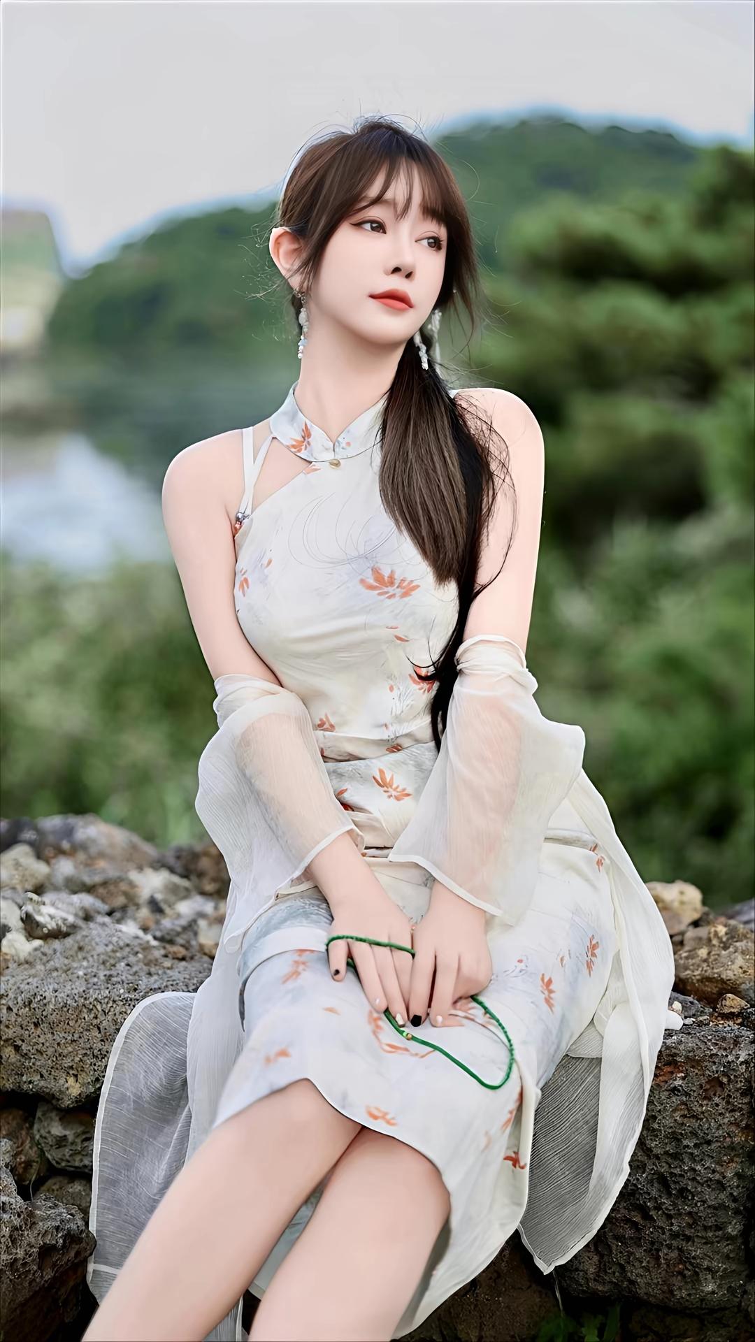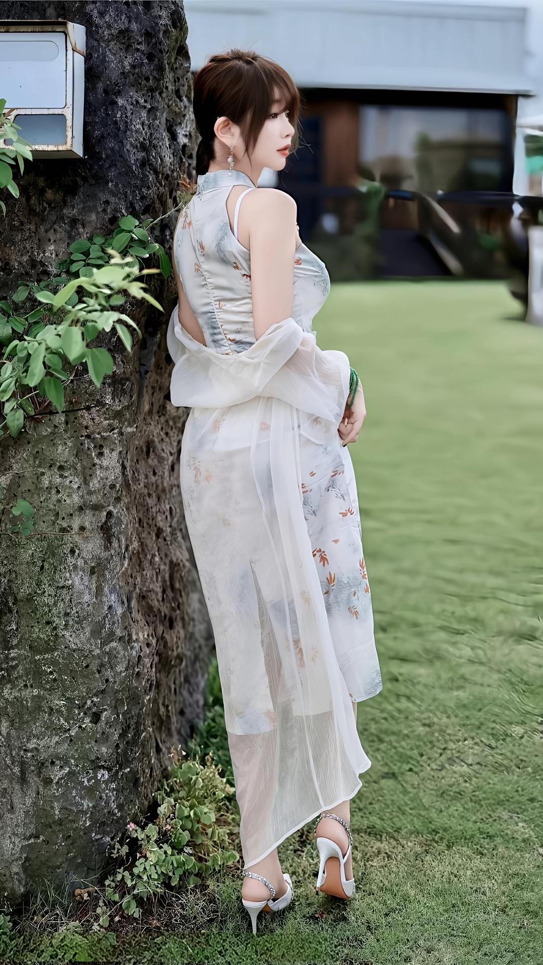 晒图笔记大赛画面中,一位女性立于户外绿植旁。她留着棕色长发,齐刘海修饰脸型,长发在脑后扎成马尾,发间点缀着精致的发饰。她身着一套浅色系旗袍套装:内搭为立领盘扣旗袍,底色清透,点缀着橙色花卉图案,修身剪裁勾勒出优雅曲线;外搭一件轻薄的白色纱质开衫,袖口宽松,增添柔美气质。配饰上,耳畔垂着一对长款珍珠耳坠,手腕戴着绿色珠串手链,指尖涂有黑色美甲。她的姿态优雅——右手高举,似轻触空中事物;左手握着一根木质手杖,自然垂于身侧。背景是户外场景,前景是繁茂的绿色植物(叶片间隐约可见青色果实),后方道路旁停着一辆深色汽车,远处建筑与绿植被虚化,整体氛围清新自然,光线柔和明亮,尽显温婉典雅的东方韵味。