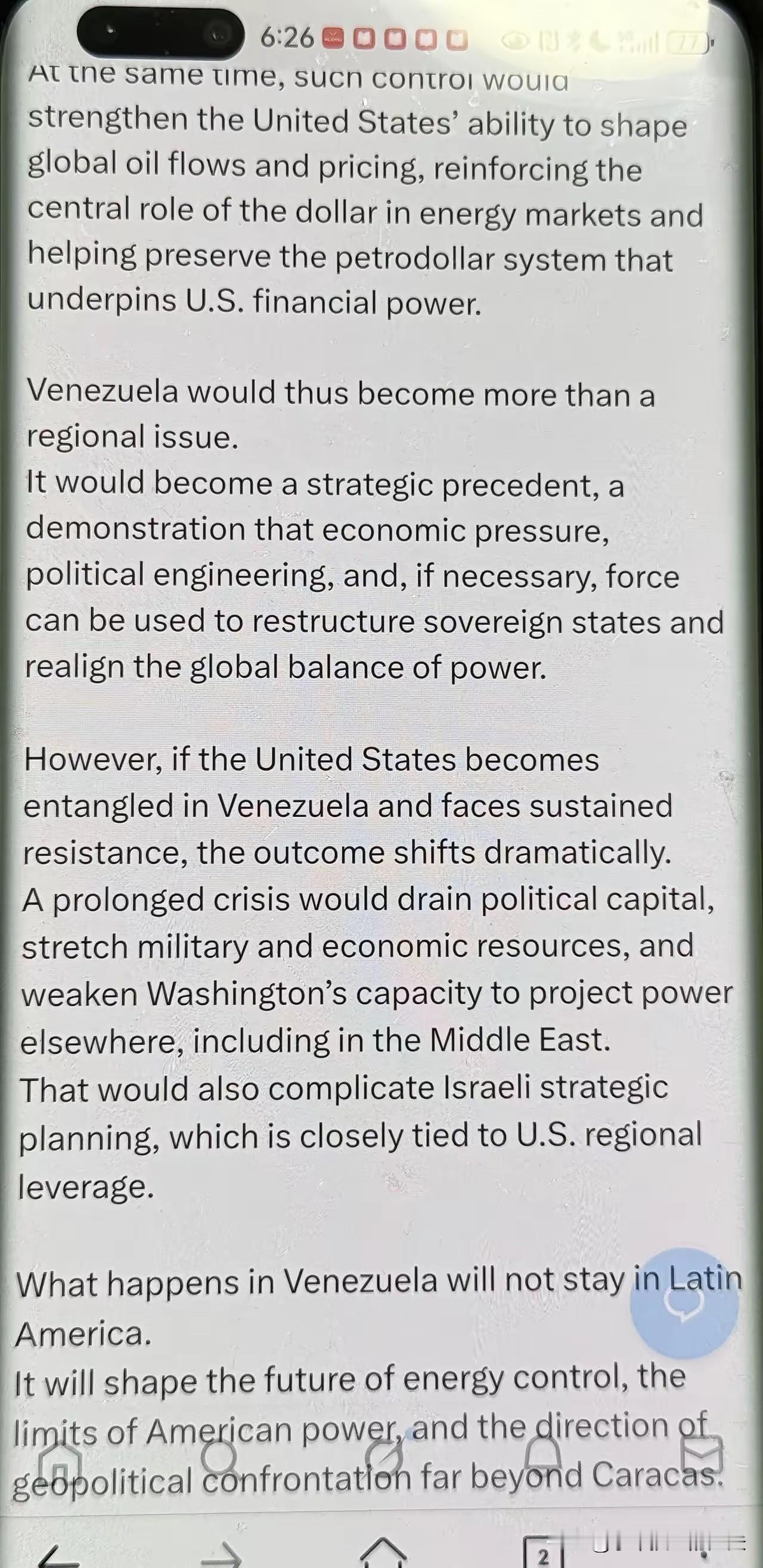 接下来的72小时对世界而言至关重要。 若美国成功掌控委内瑞拉,进而掌控全球已探明的最大石油储量,这将标志着全球权力格局发生重大转变。 此举无关恢复民主或保障人权,而是为了重新确立在能源、贸易航线及地区联盟中的战略主导地位。 2026年1月3日凌晨,加拉加斯的爆炸声打破了加勒比海的宁静。美军三角洲特种部队用三小时完成突袭,特朗普随即宣称抓获马杜罗夫妇,这场精心策划的行动,不过是美国掠夺资源的最新注脚。 委内瑞拉3030亿桶的探明石油储量占全球18%,潜在价值超6.8万亿美元,相当于美国2025年GDP的四分之一,这样的“地下金库”,早被白宫纳入觊觎清单。 美国自己本就是全球最大产油国,2024年日均产量超1300万桶,却仍对委内瑞拉步步紧逼。 所谓“缉毒”“反恐”都是幌子,《纽约时报》早已披露,没有任何证据表明马杜罗直接参与毒品交易,而被美方列为“恐怖组织”的“太阳集团”,甚至不是一个结构严密的实体。 真正的目标,是奥里诺科重油带那片全球最大的重油蕴藏区,以及马拉开波湖这条石油出口关键通道。 58岁的马里奥在马拉开波湖的油井工作了32年,见证过委内瑞拉石油产业的黄金时代。 “20年前,我们日均产油300万桶,工资能养活全家,还能每年出国旅游一次。”他的声音带着疲惫,美国多年制裁让油井设备50年未更新,产能骤降至日均120万桶,“现在工资只够买半盒抗生素,我妻子的癌症药物涨了三倍,根本负担不起”。 美国封锁导致委内瑞拉90%依赖进口的药品原材料断供,胰岛素注射器价格飙升至国际市场价的三倍以上,这样的人道主义危机,华盛顿选择性失明。 国际社会的谴责声浪从未停止。古巴称其为“国家恐怖主义”,伊朗呼吁联合国追责,俄罗斯直接提供S-400防空系统支持,巴西、墨西哥等拉美国家更是抱团反对美国干涉内政。 美国国内也一片质疑,60%民众反对对委动武,民主党参议员加列戈直言“美国成了世界霸凌者,应当羞愧”。 但这些都挡不住白宫的霸权步伐,毕竟掌控委内瑞拉石油,就能卡住全球1.066亿桶/日的需求缺口,重新主导西半球能源贸易航线。 更值得警惕的是“特朗普推论”下的新门罗主义,美国明确将西半球视为“自家后院”,试图通过扶植亲美政权,让委内瑞拉成为第二个巴拿马。 1990年美国抓走诺列加,2026年突袭马杜罗,历史总是惊人地相似。一旦亲美政权上台,委内瑞拉石油将优先供应美国及其盟友,全球能源供需格局将被强行改写,本就宽松的石油市场可能出现人为短缺,推高国际油价。 委内瑞拉国防部长洛佩斯仍在呼吁民众抵抗,副总统罗德里格斯坚持履行职权,要求美方出示马杜罗活着的证据。 中俄持续提供支持,委内瑞拉通过“灰色渠道”维持对华对印石油出口,这些都让美国的“占领计划”难以一帆风顺。 但72小时的窗口期内,局势仍可能随时反转,美军在加勒比海的航母打击群和核动力潜艇,还在虎视眈眈。 能源博弈的背后,从来都是普通人的命运沉浮。马里奥现在每天最担心的不是油井产量,而是上大学的儿子能否凑齐学费,妻子的抗癌药还能支撑多久。 当大国为了战略主导权兵戎相见,被牺牲的永远是弱小国家的民生与尊严。这场危机不仅关乎委内瑞拉的主权,更关乎全球是否还能守住“不干涉内政”的国际法底线。 各位读者你们怎么看?欢迎在评论区讨论。