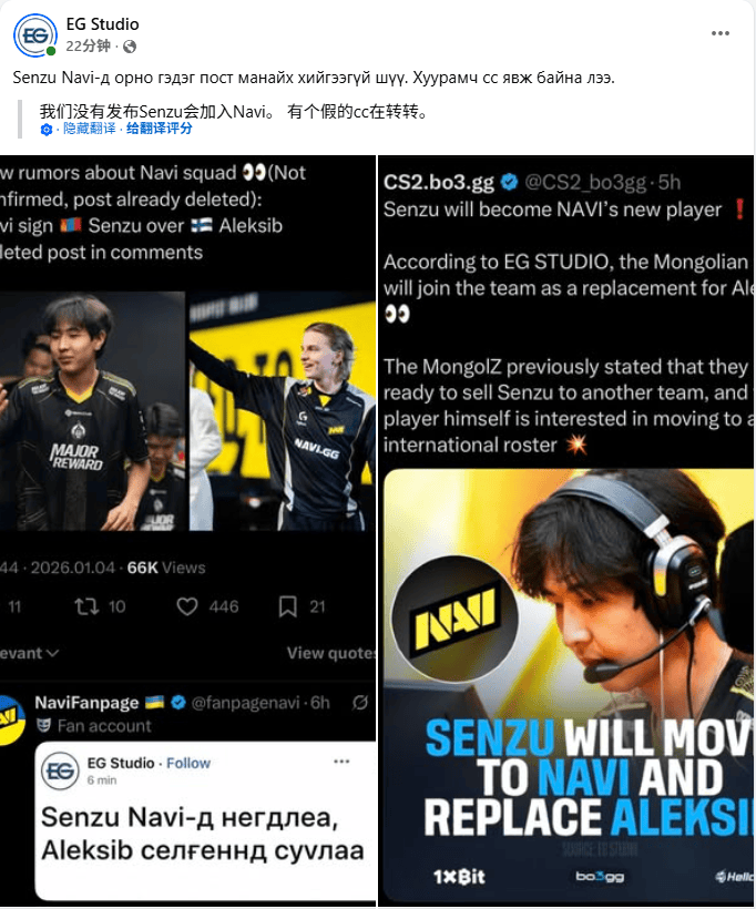 虎扑01月04日讯蒙古国媒体、媒体人机构EGStudio发文辟谣:“我们没有发布关于Senzu将会加入NAVI的爆料,那是假贴子。