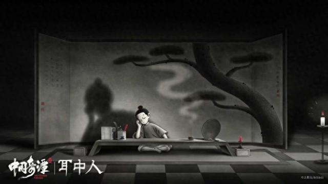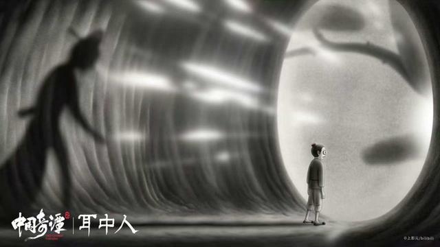 《耳中人》奇趣诡谲。导演胡睿又一次向《聊斋志异》找寻灵感。《耳中人》脱胎于卷一中的同名篇章,又跳出传统叙事框架,发展为探讨内心欲望的现代寓言。胡睿说,在搜集创作素材时关注到了“傀儡戏艺人”这一传统形象,“旧时有一种艺人住在戏台里,表演与生活合一,试图用戏剧解决一切问题”。受之启发,动画中的主人公谭秀才也被设计成这样“疯魔”的人物,借助戏曲舞台与耳中人周旋。