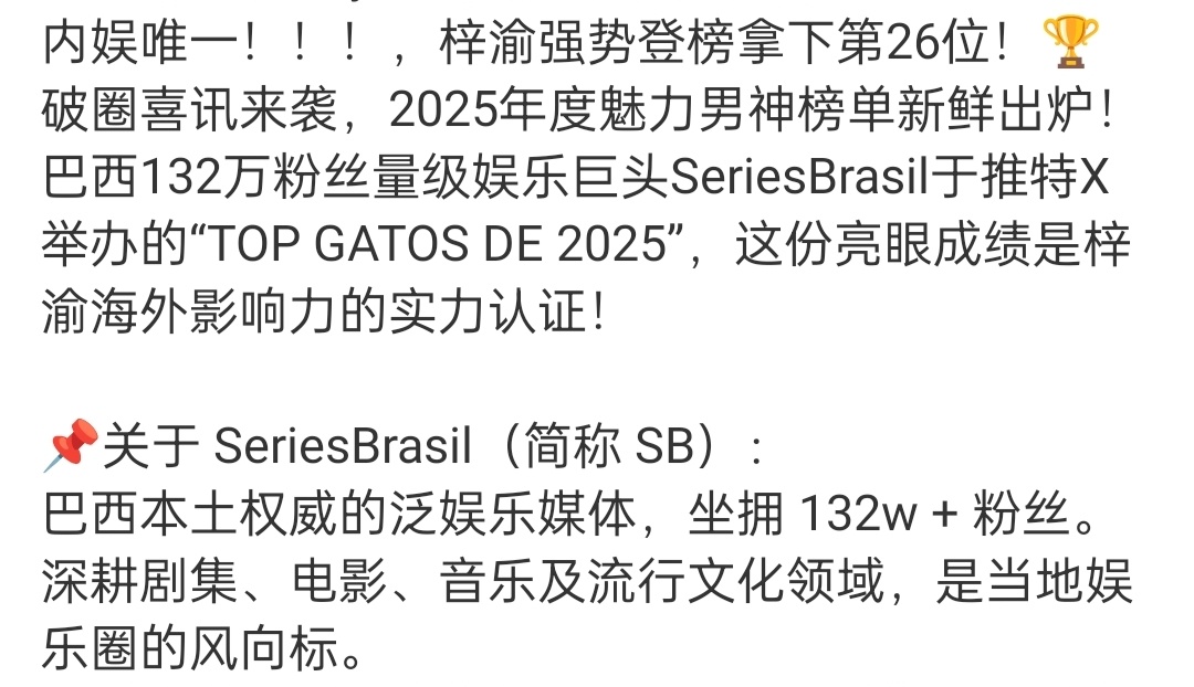 梓渝登巴西2025年度魅力男神榜恭喜梓渝海外知名度与影响力再次得到认证!内娱唯一登榜!拿下【巴西2025年度魅力男神榜单】第26名🎉梓渝陆家嘴百米超长屏