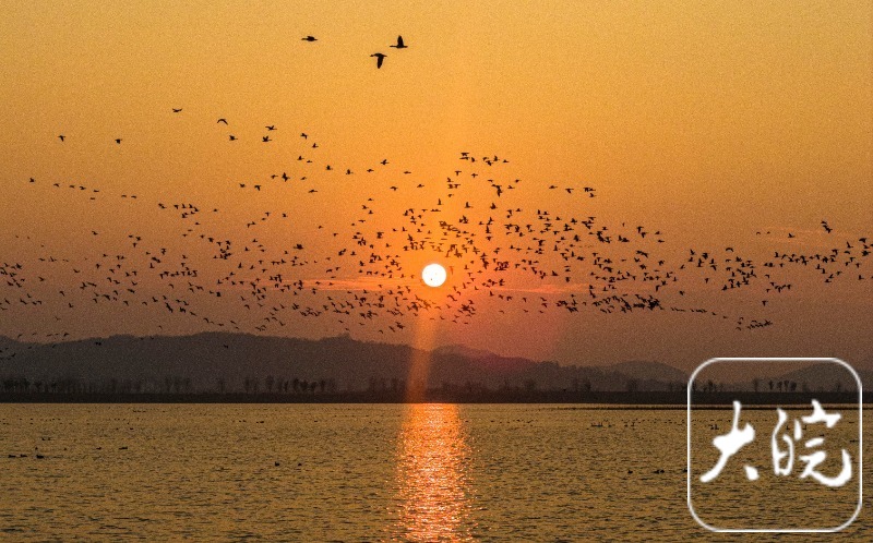 大皖新闻讯1月3日,在合肥市庐江县黄陂湖湿地,上万只候鸟尽情嬉戏、飞翔,不断形成鸟浪在湖面上飞舞,在落日映衬下,奏起生机勃勃的生态交响曲。