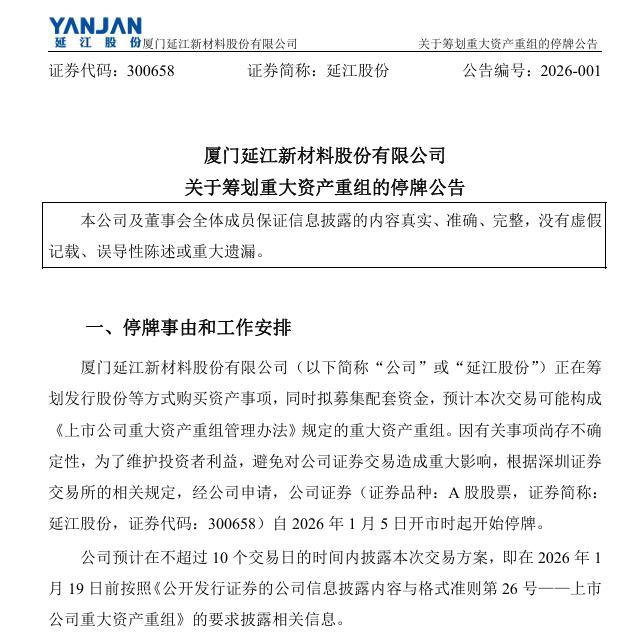 2026年1月4日,延江股份(300658.SZ)发布公告称,拟以发行股份及支付现金的方式购买宁波甬强科技有限公司(下称“甬强科技”)控制权,并募集配套资金。预计本次交易可能构成重大资产重组,延江股份股票自2026年1月5日开市起开始停牌,预计在不超过10个交易日的时间内披露本次交易方案。