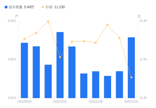 日期A股户数(户)流通A股户均持股数(股)户均持股市值(万元)2025-12-315490845705.6751.332025-12-194436656565.9968.162025-12-104289958500.3572.072025-11-284433456606.8267.652025-11-204365157492.5468.882025-11-105206048206.0457.702025-10-315656544366.7851.692025-10-204639754089.8567.022025-10-105209348175.5158.532025-09-305320447169.5156.74