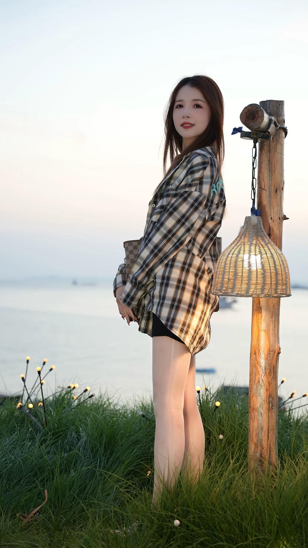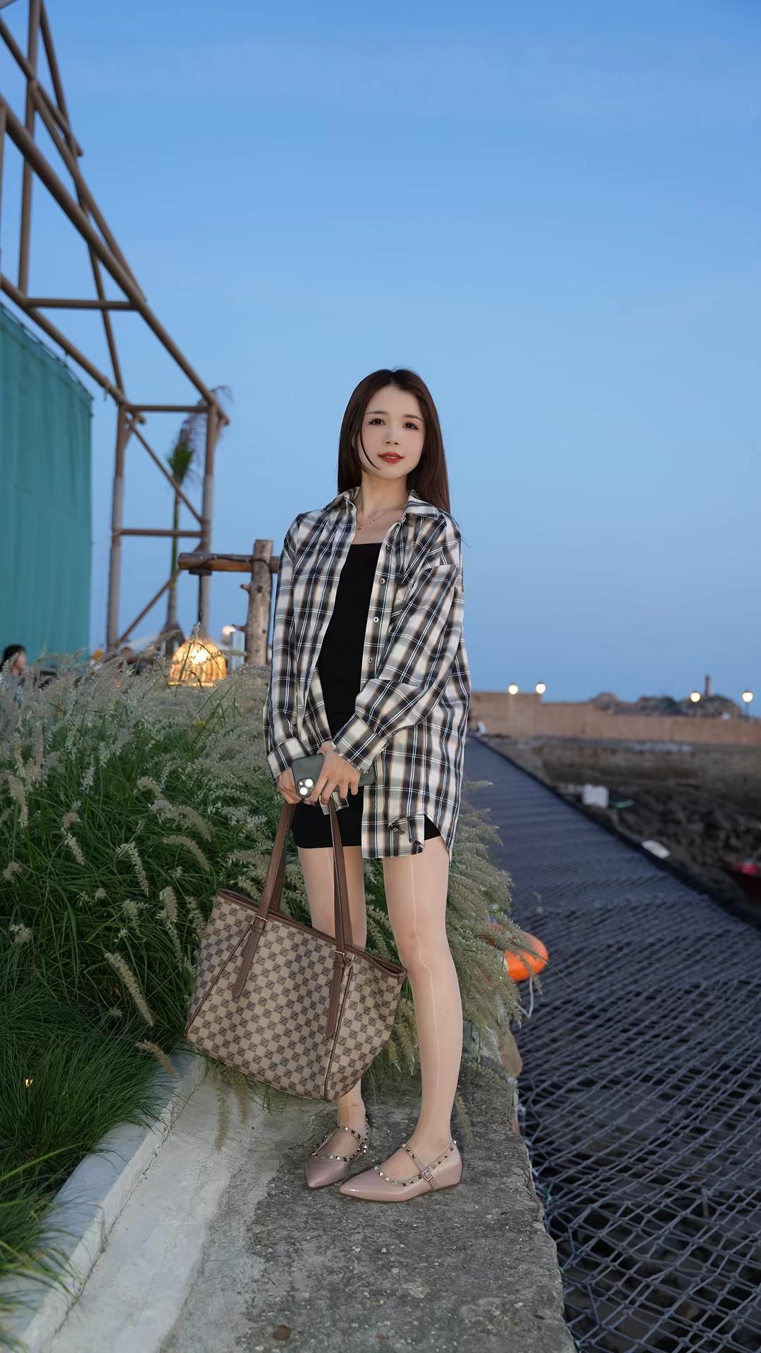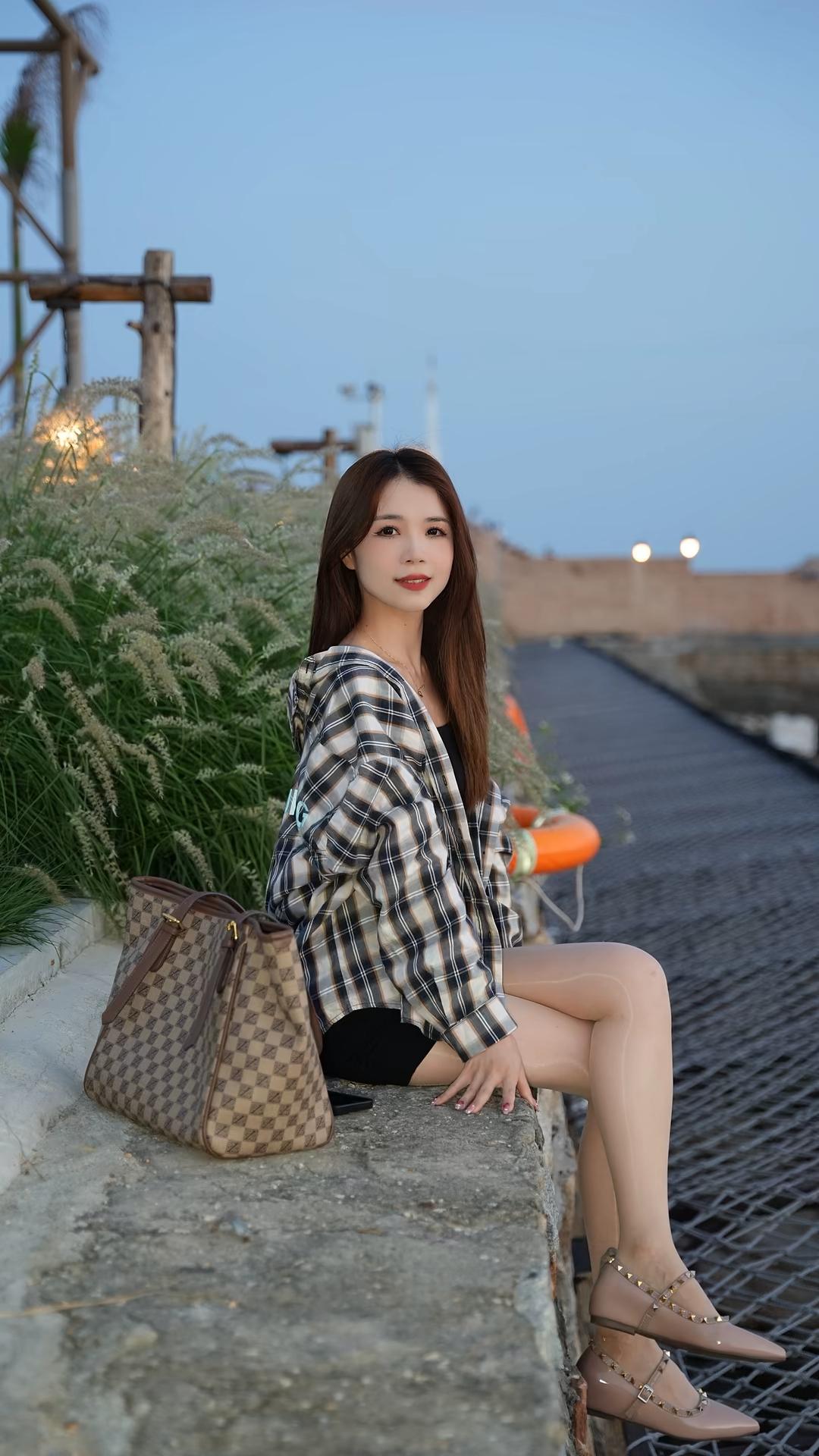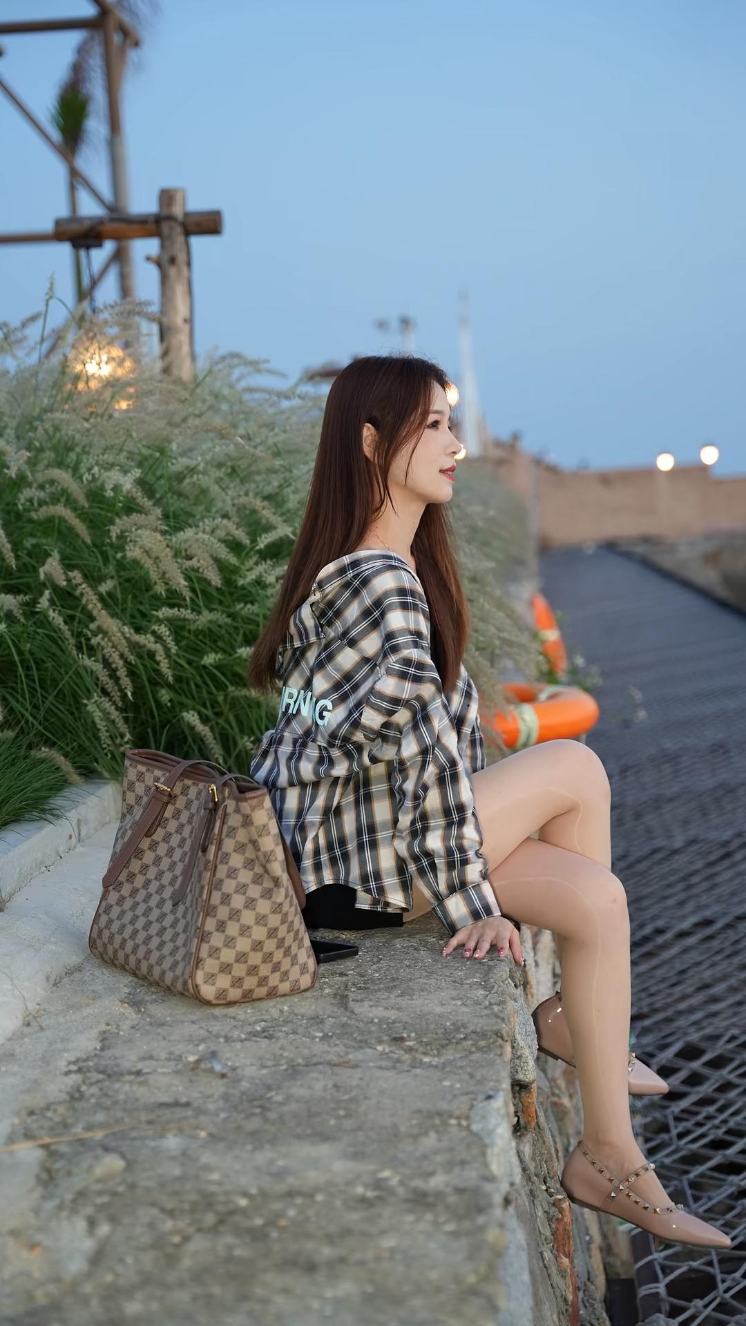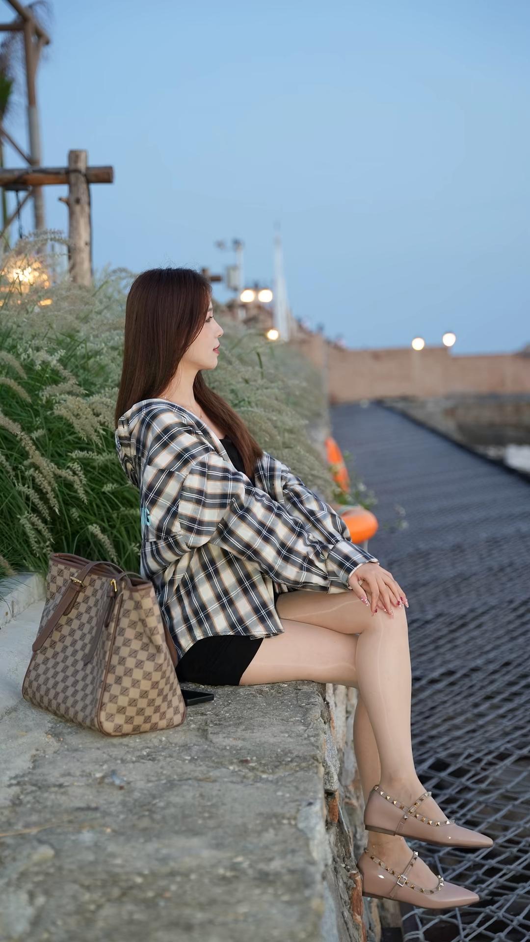 人物形象与穿搭 - **服装**:她身着一件**黑白格子连帽衬衫**,格纹线条清晰,衬衫版型宽松,袖长至手腕,衣长盖过臀部,连帽设计增添休闲感;内搭为**黑色上衣**(领口微露),下装是**黑色短裤**,短裤长度较短,充分露出腿部线条。 - **腿部与鞋子**:搭配**肉色超薄丝袜**,紧贴腿部,呈现光滑细腻质感;脚踩一双**裸色尖头平底鞋**,鞋面饰有金色铆钉,鞋带绕脚踝一周,配有金属扣,设计精致又带点个性。 - **发型与妆容**:深棕色长直发自然垂落,发尾微散,侧脸示人,面部线条柔和,肤色白皙,姿态安静。 - **姿态**:她坐在一条**水泥石阶**边缘,石阶边缘有砖块包边;双腿交叉(左腿叠于右腿上),双手交叠轻放于大腿旁,身体侧向画面右侧,眼神望向远方,整体姿态松弛自然。 道具与环境 - **随身物品**:身旁放着一只**棕色格纹托特包**,包身是米色与棕色交织的棋盘格图案,配棕色皮革提手与金属扣件,包型挺括,放置在石阶上。 - **背景环境**:左侧是茂盛的**浅绿色观赏草**(类似狼尾草),草丛后方有木质结构支架,远处可见暖黄色灯光;右侧是延伸向远方的**黑色网格步道**,步道旁有橙色圆形浮标状物体;远景是土黄色矮墙,墙后有白色建筑尖顶与路灯(灯光为圆形暖光),天空呈淡蓝色,光线柔和,推测为傍晚时分。 整体氛围 画面色调清新自然,人物穿搭兼具休闲与时尚感(格子衬衫+丝袜+铆钉鞋),背景的植物、灯光与步道营造出户外休闲场景,传递出都市女性在自然环境中放松、自在的状态。结合参考文档“没有滤镜,真实的方格子衬衣,搭配牛仔短裙黑色打底衣,很自然”的核心逻辑,图片中格子衬衫的真实质感、自然光线下的穿搭呈现,进一步强化了“日常真实感”与“时尚松弛感”的融合。