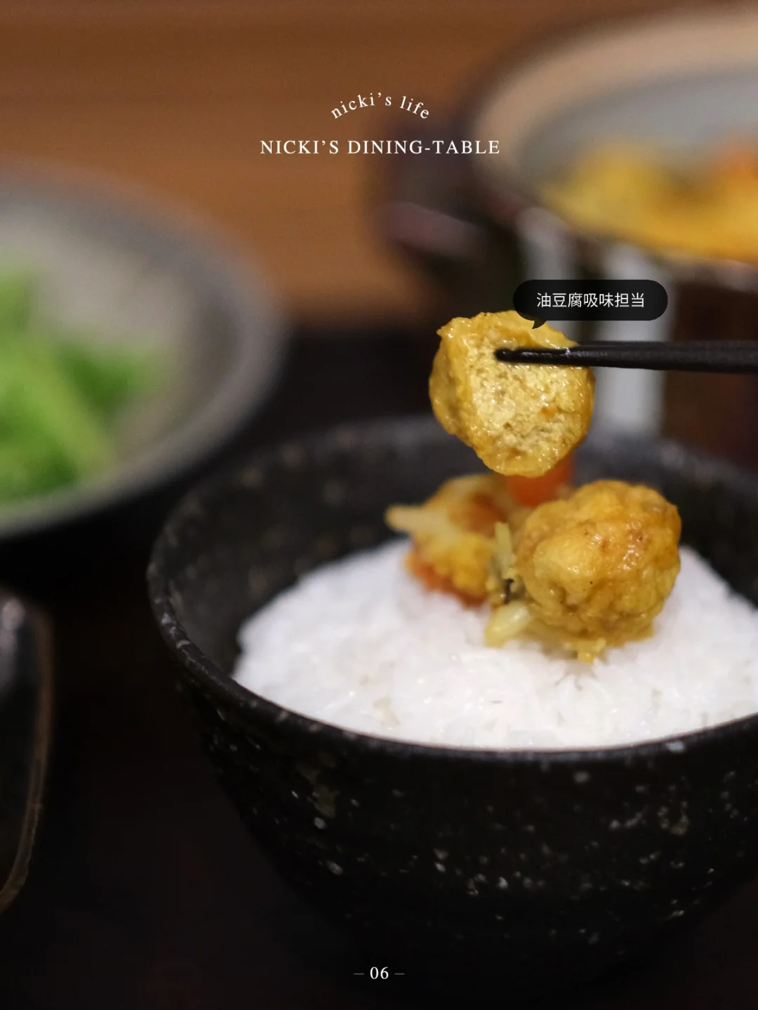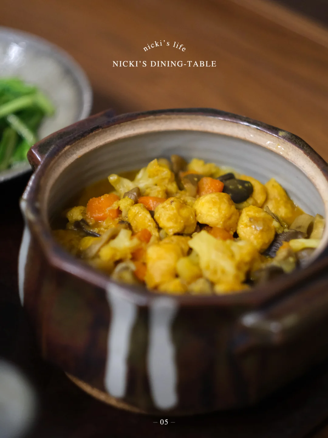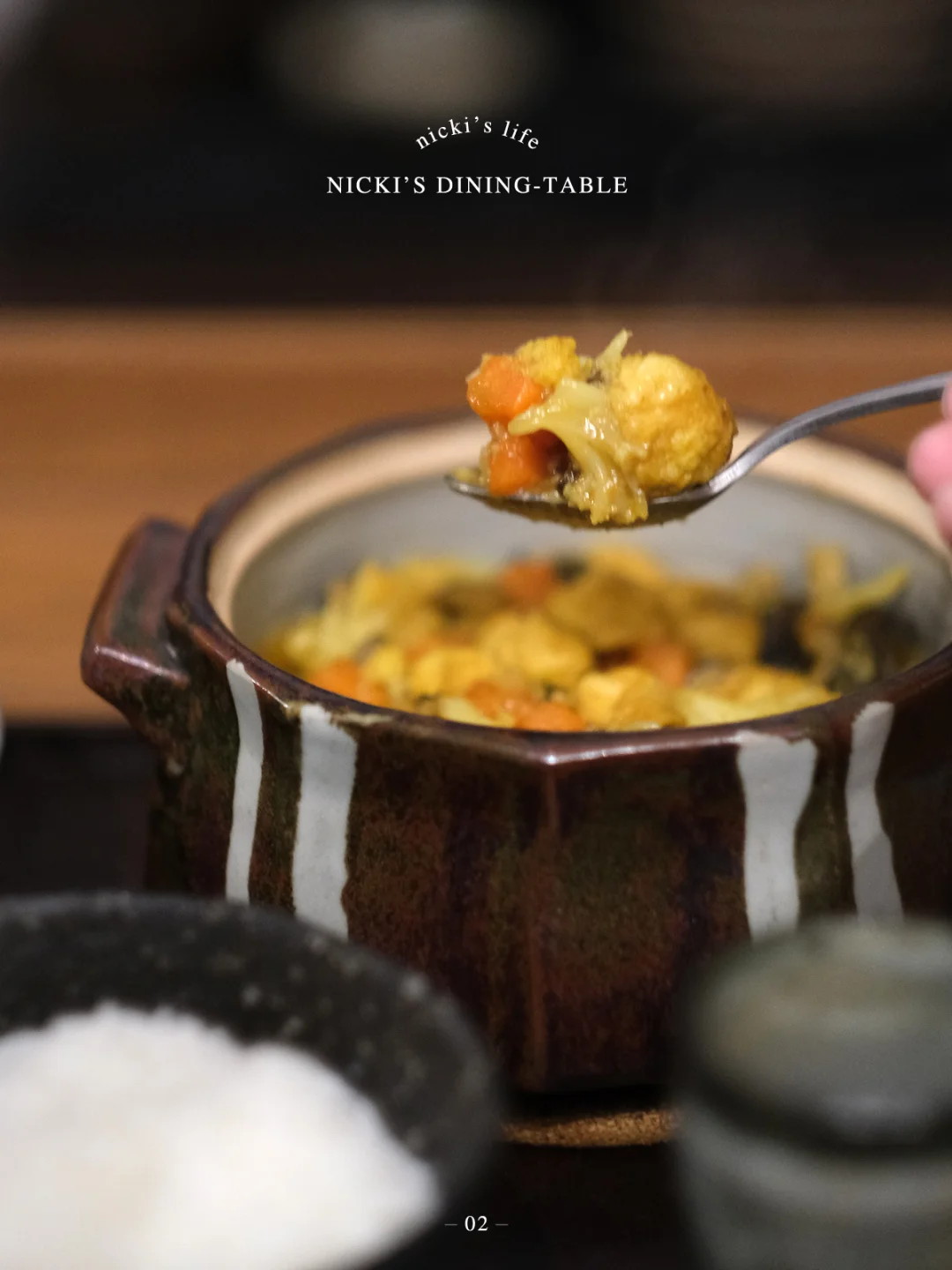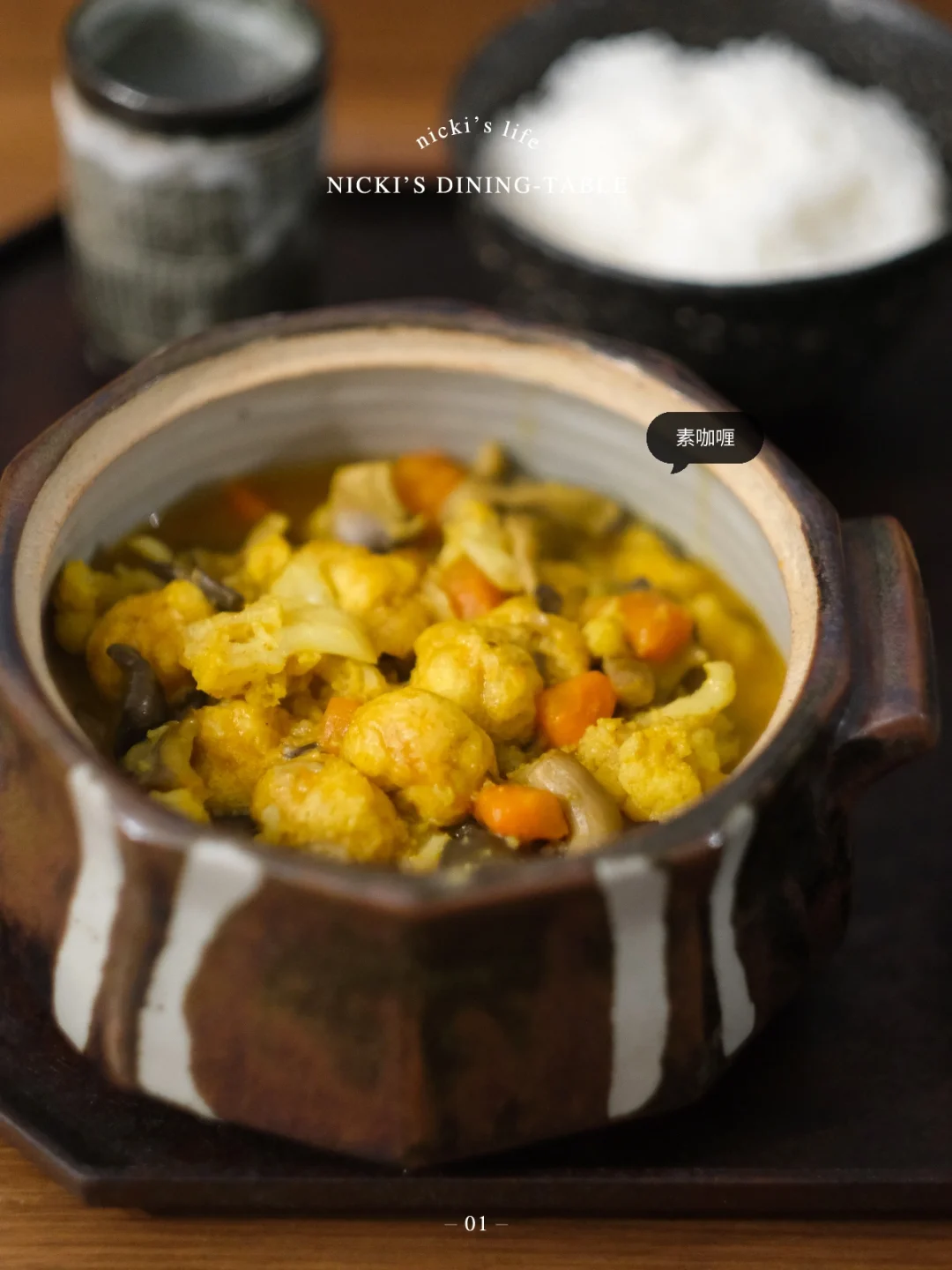 大人的假期已结束,开始干活… - 🔅今日c位菜谱:素咖喱🔅 ·胡萝卜切丁,小平菇对半撕开,花菜切小块,油豆腐对半切开。 ·锅中倒油,放入胡萝卜与平菇,炒至平菇缩水后加水,放入两块咖喱块。 ·待咖喱块融化后放入花菜,煮5分钟后放入油豆腐再焖煮3分钟即可。 🥗 菜单: -素咖喱 -清炒水芹菜 -爆浆豆腐