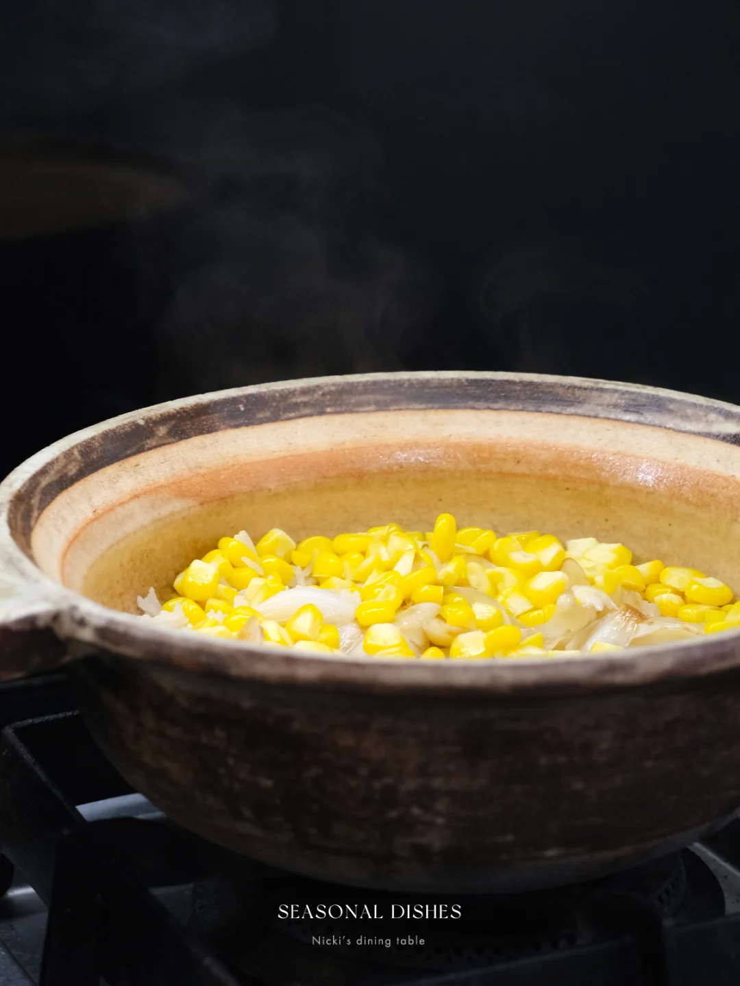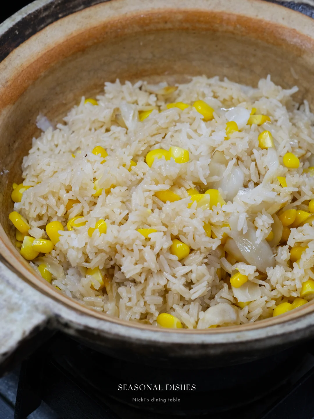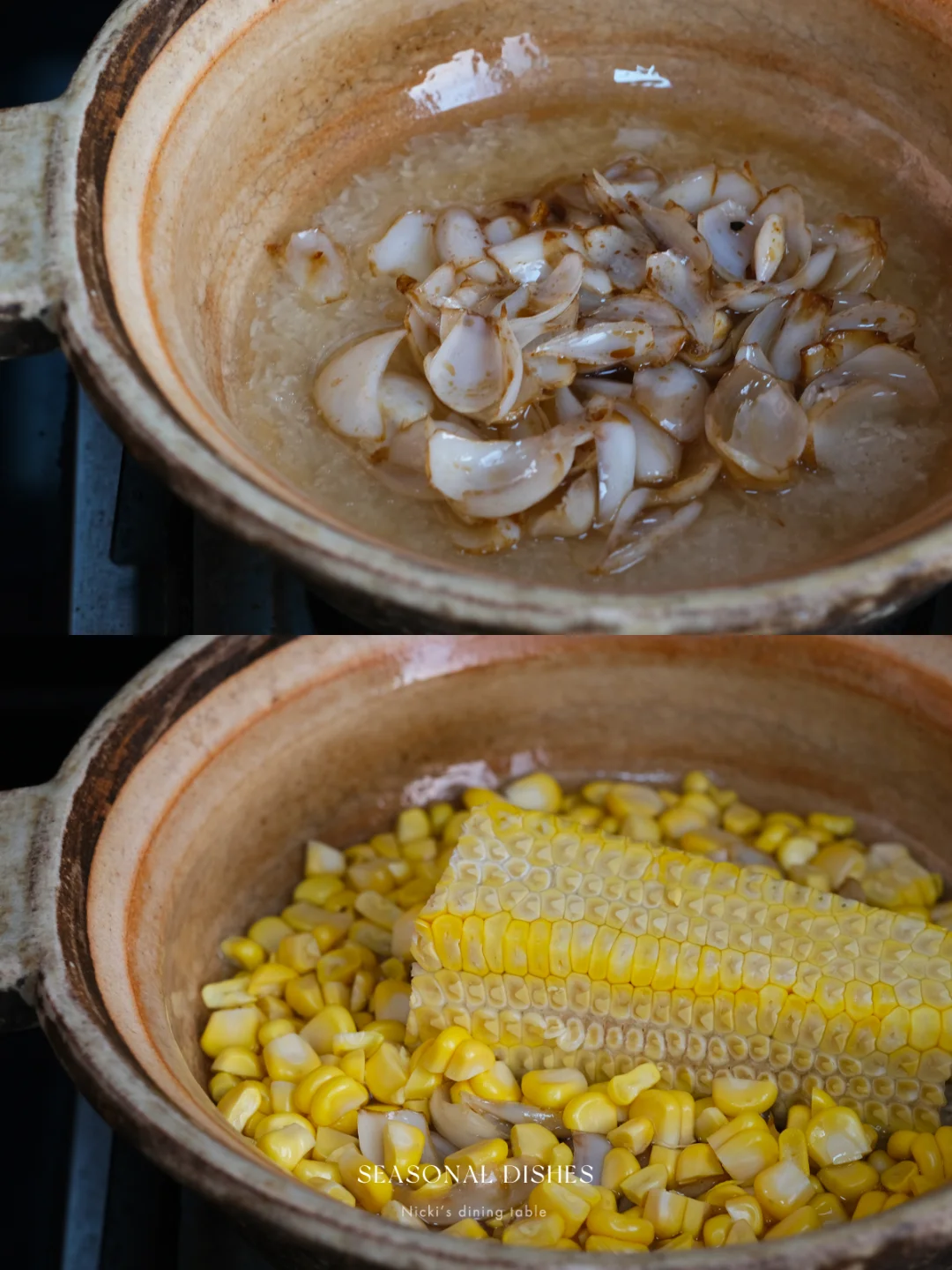 ·土锅中倒入洗好的米,加水没过米半个指甲盖的高度,铺入百合、玉米粒,以及玉米芯。