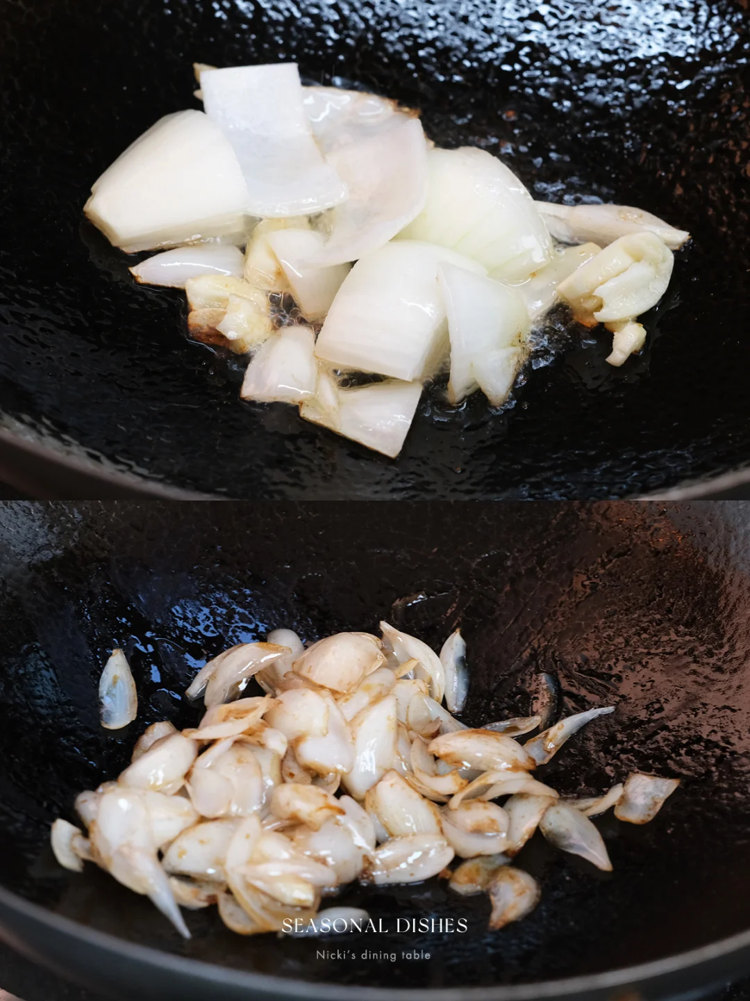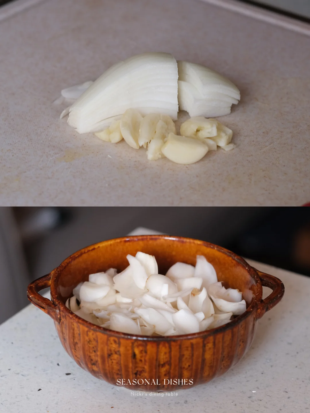 福和慧这一季有一道料理:啫啫百合。整颗百合下铺满洋葱,每一片吃起来甜香软糯。回家后念念不忘,但觉得它好吃但不太下饭,所以把它做成了焖饭的形式。