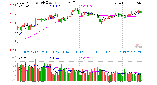1月5日,MSCI中国A50ETF(560050)开盘涨0.09%,报1.058元。MSCI中国A50ETF(560050)重仓股方面,宁德时代开盘涨0.75%,紫金矿业涨2.41%,工业富联涨2.00%,贵州茅台涨0.57%,海光信息涨1.38%,寒武纪涨1.43%,比亚迪涨0.70%,恒瑞医药涨0.82%,立讯精密涨0.72%,中际旭创涨1.82%。