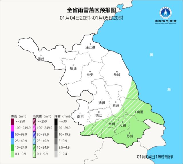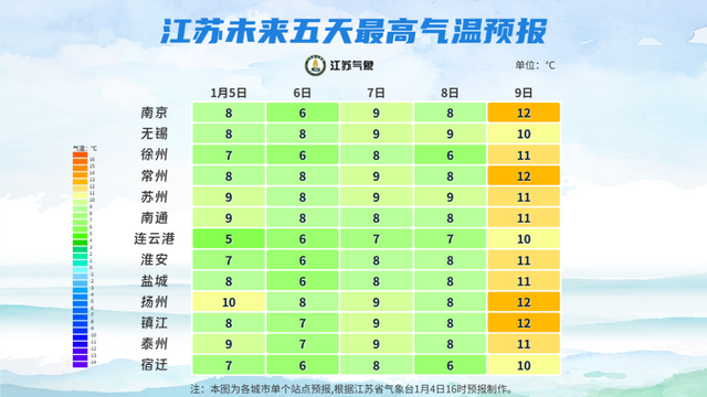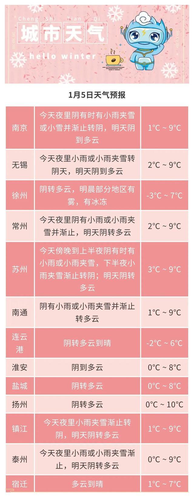 1月4日20时至1月5日20时,沿江和苏南地区阴有小雨或雨夹雪并渐止转阴,其他地区阴转多云。最高温度:沿淮和淮北地区6~7℃,其他地区8~9℃;最低温度:沿江和苏南地区1~2℃,沿淮和淮北地区-1~-2℃,其他地区0℃左右。全省偏北风4级左右。