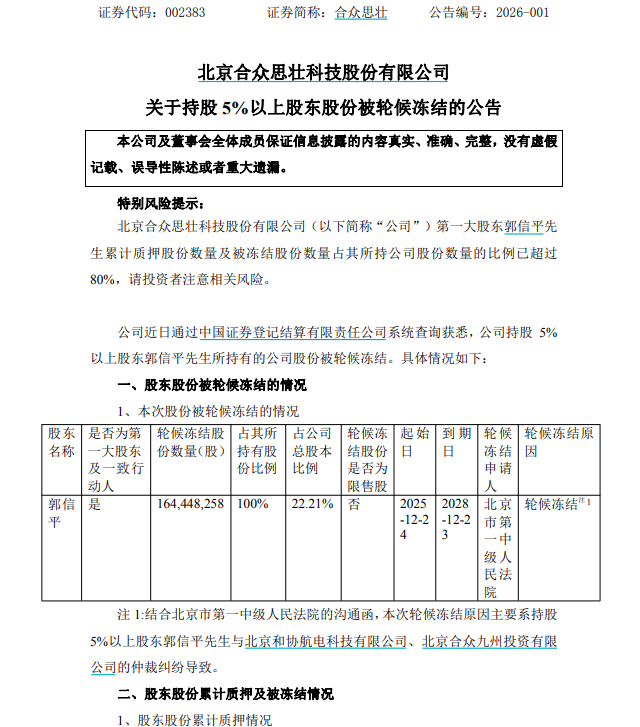 合众思壮(002383.SZ)1月5日公告,股东郭信平所持1.64亿股公司股份被北京市第一中级人民法院轮候冻结,占其所持股份的100%,占公司总股本的22.21%,冻结起始日期为2025年12月24日,冻结结束日期为2028年12月23日。