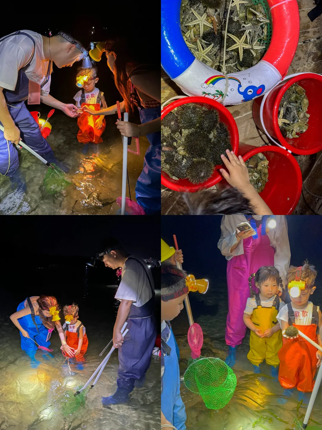 ✔️晚上在新村码头坐船去赶海🌊,我们收获了海星、海胆、螃蟹🦀、虾,可以提上战利品去新村夜市加工,可以做辣炒螃蟹,海鲜粥、海胆蒸蛋