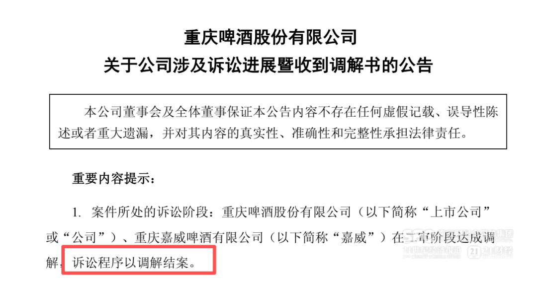 2025年12月31日,重庆啤酒股东大会通过了双方协商的《调解协议》。重庆啤酒1月5日的公告称,双方于2025年12月31日从重庆高院领取调解书,诉讼程序以调解结案。