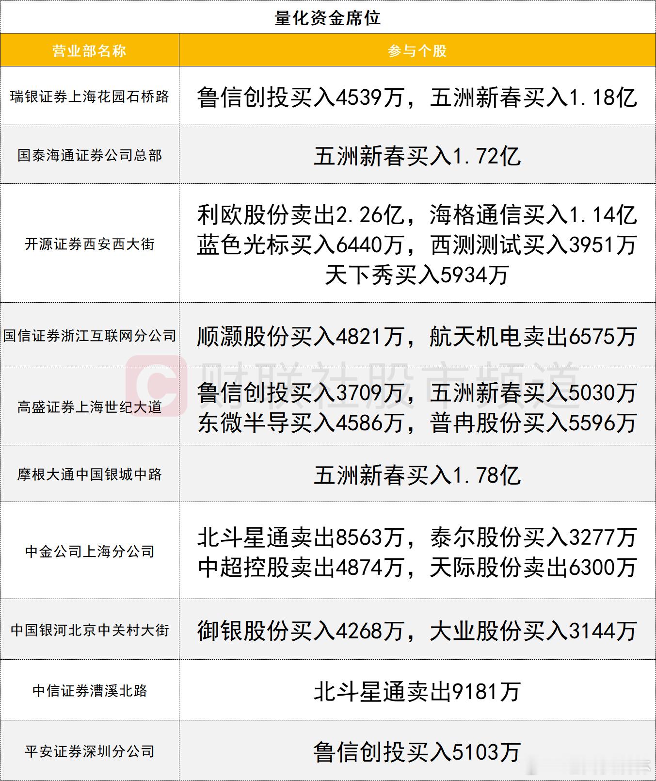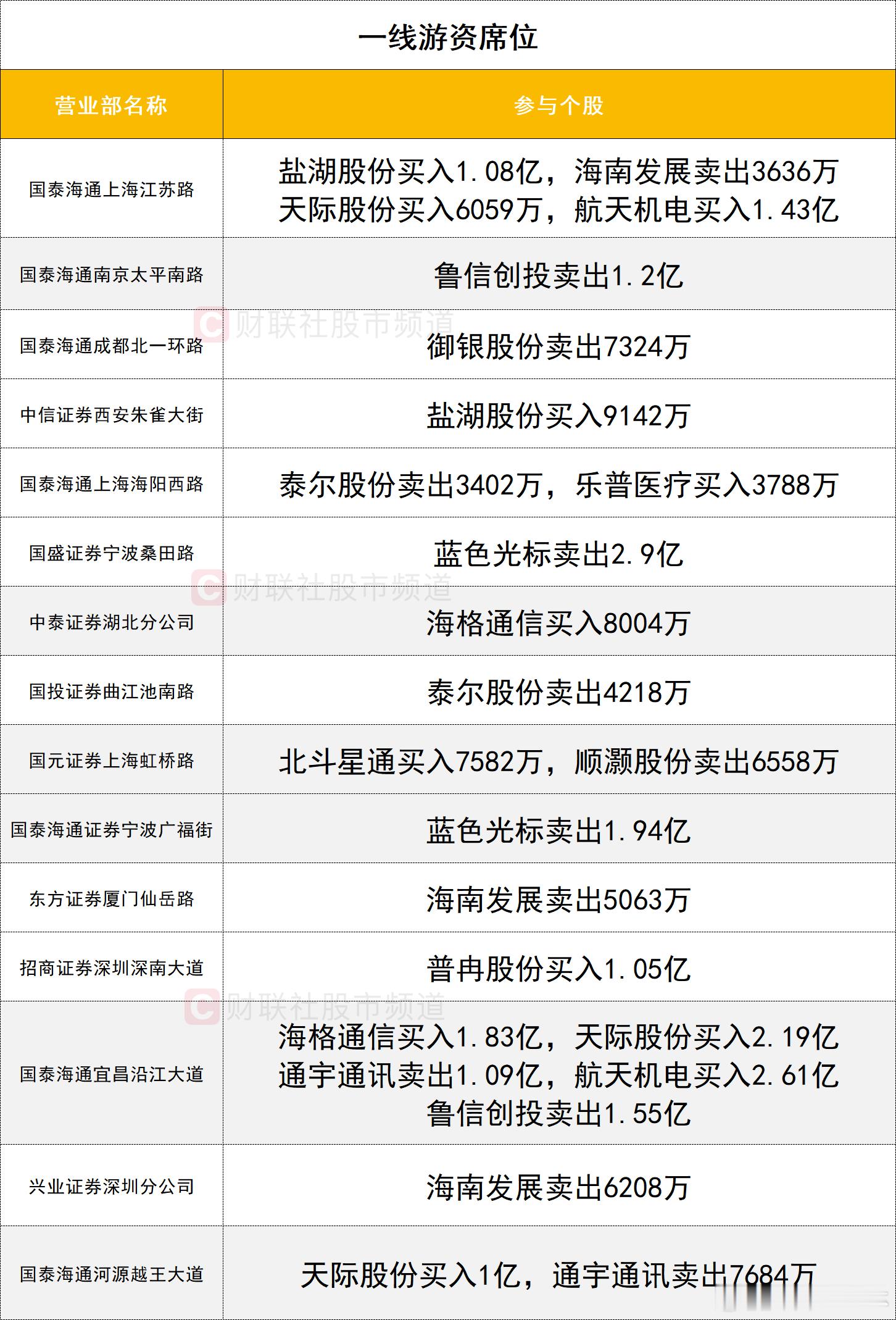 a股龙虎榜 龙虎榜1、机构今日龙虎榜机构活跃度明显提升,买入方面,AI应用概念股蓝色光标走出2连板,获两家机构买入1.86亿,同时获深股通买入1.56亿。军工人气股江龙船艇获三家机构买入9588万。卖出方面,多只商业航天概念股遭机构甩卖,其中中超控股遭三家机构卖出2.2亿,华菱线缆遭四家机构卖出1.15亿,北斗星通遭两家机构卖出1.05亿,海格通信遭两家机构卖出1.7亿。2、游资一线游资活跃度较高,今日锂电池概念股表现强势,多家一线游资抢筹。其中天际股份获(国泰海通证券宜昌沿江大道、国泰海通证券河源越王大道、国泰海通证券上海江苏路)分别买入2.19亿、1亿、0.6亿。业绩预喜的盐湖股份获(国泰海通证券上海江苏路、中信证券西安朱雀大街)分别买入1.08亿、0.91亿。AI应用概念股蓝色光标遭两家一线游资(国盛证券宁波桑田路、国泰海通证券宁波广福街)分别卖出2.9亿、1.94亿。量化资金活跃度较高,人形机器人概念股五洲新春今日炸板回落,四家量化资金(瑞银证券上海花园石桥路、摩根大通上海银城中路、国泰海通证券总部、高盛证券上海世纪大道)分别买入1.18亿、1.78亿、1.72亿、0.5亿。