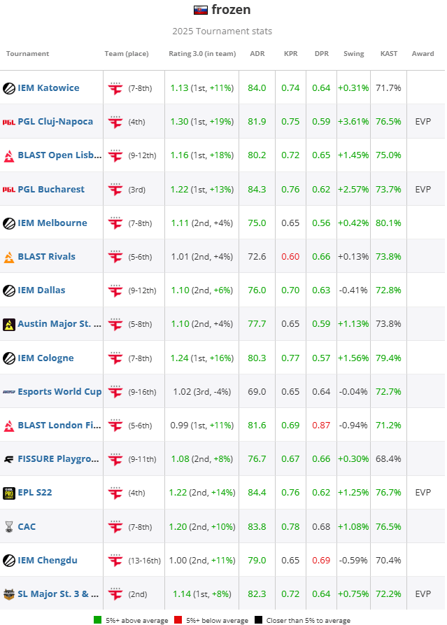 进入季后赛后,frozen提升了比赛状态,并成为FaZe获得季军征程中的关键人物。他完全统治了与3DMAX的对决,打出了极其夸张的数据:+13.83%IMPACT、117ADR以及2.20的rating。尽管FaZe在半决赛中输给了Falcons,但frozen毫无责任——他不仅在Ancient地图的胜利中carry了队伍,更在至关重要的Mirage决胜图上进行了顽强抵抗。