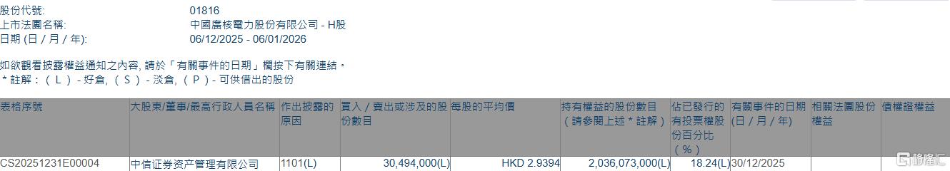 格隆汇1月6日丨根据联交所最新权益披露资料显示,2025年12月30日,中广核电力(01816.HK)获中信证券资产管理有限公司在场内以每股均价2.9394港元增持3049.4万股,涉资约8963.41万港元。