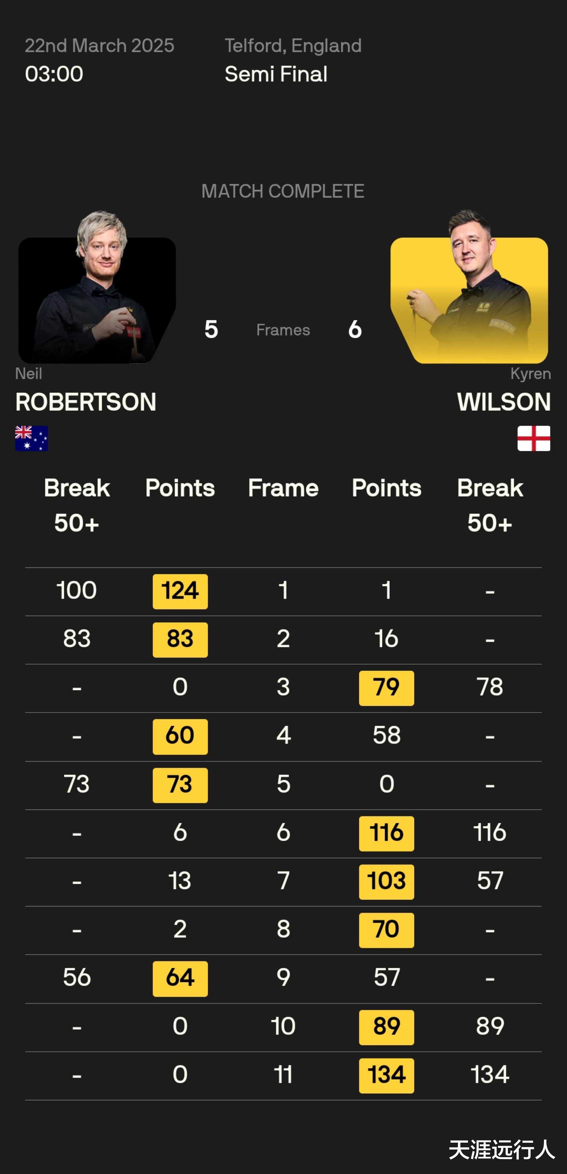 本场比赛,尼尔·罗伯逊打出一杆100破百和83、73、56分三杆单杆50+,凯伦·威尔逊打出116、134分两杆破百和78、57、89分三杆单杆50+。威尔逊第三局两次上手,打出单杆78分致胜,前五局1-4落后于罗伯逊;囧哥奋起直追,连扳三局将大比分追平。第九局,已经被延分的情况下,威尔逊打出高难度清台,把这个单局拉到黑点决战,不意在争黑时,母球摔袋,罗伯逊胜出,以5-4先达赛点。痛定思痛,接下来威尔逊打出单杆89、134分,再也没让罗伯逊攻进任何一颗球,连下两城,以6-5残酷逆转罗伯逊,率先晋级决赛。