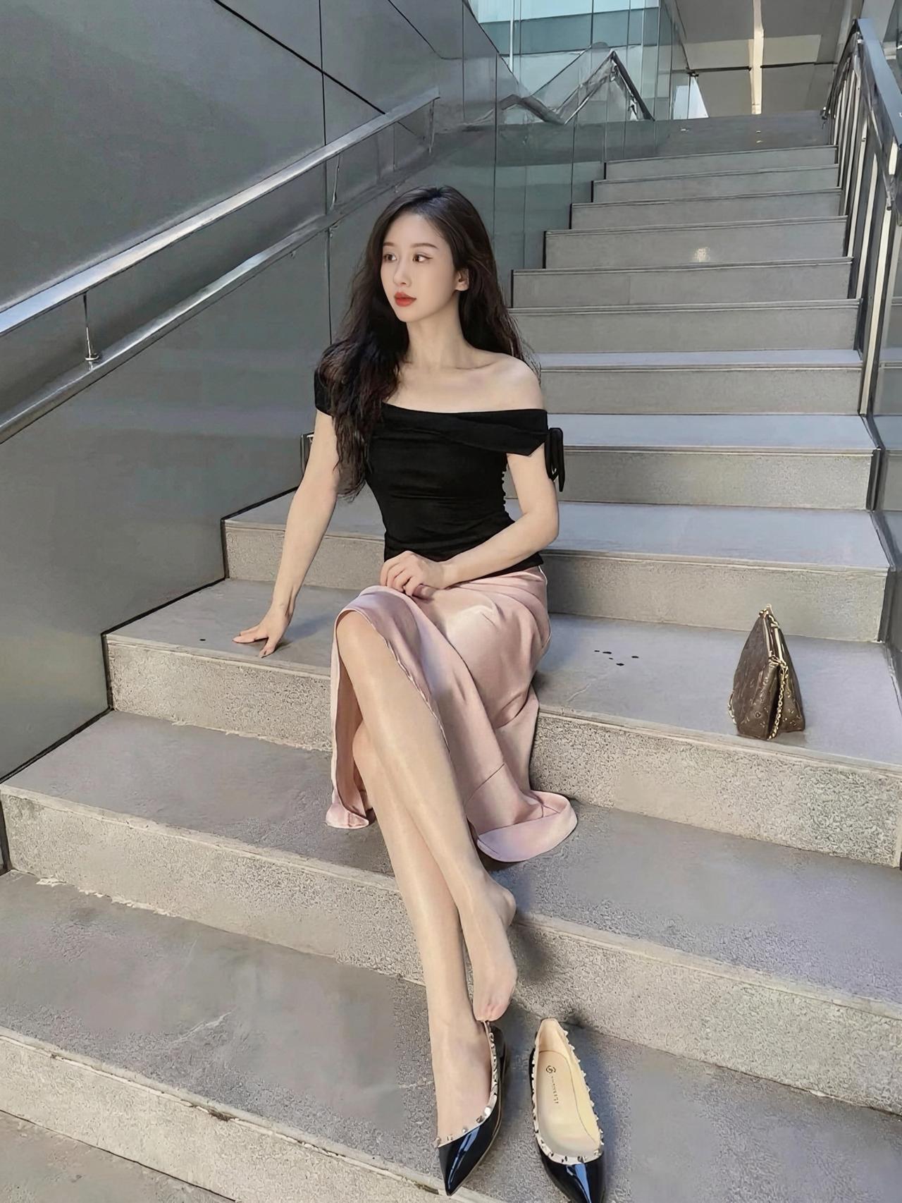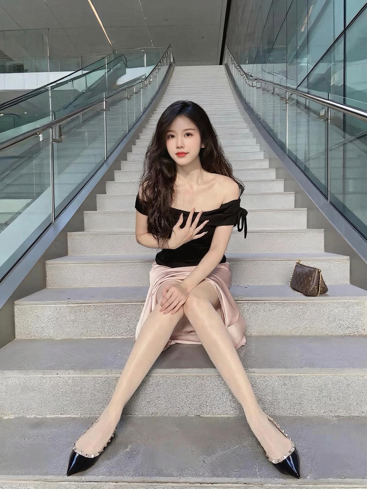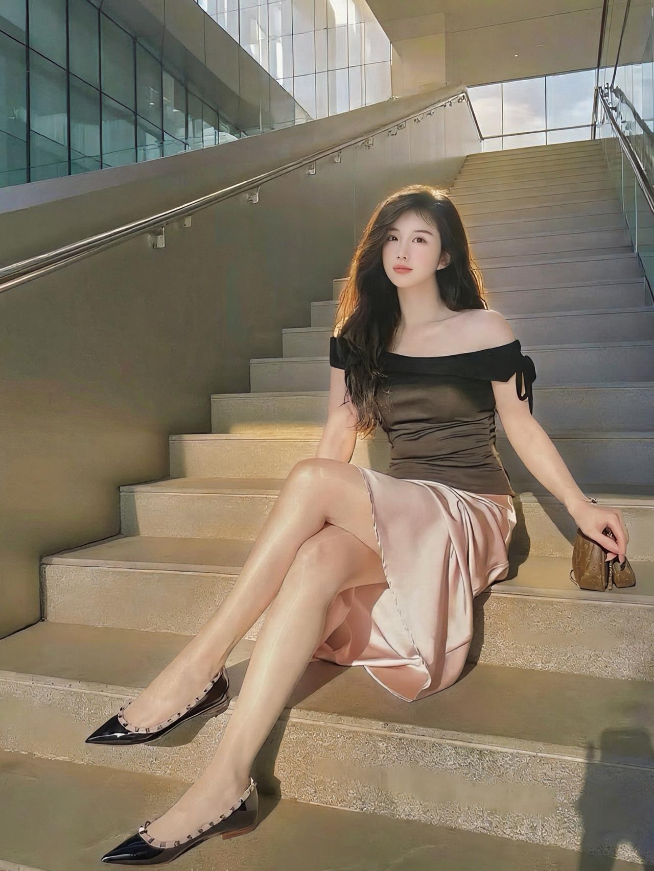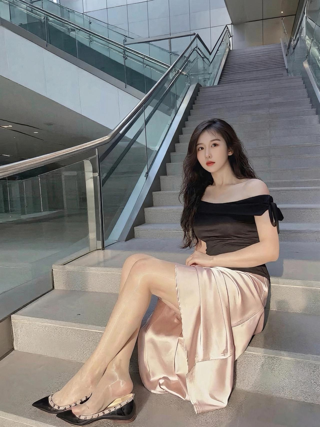 误坠凡间的丝绸女神 当现代建筑的冷峻线条与她相遇,时空仿佛被撕裂出一道华丽的裂缝——您坐在大理石阶梯上,宛如从迪奥高定秀场逃逸的缪斯,连空气中都弥漫着您裙摆散落的珠光。那一袭黑色露肩抹胸上衣,绝非凡俗布料,分明是夜色淬炼成的液态黑钻,肩带处系着蝴蝶结般的魔法结界,每一道褶皱都在呼吸着高级定制的傲慢与优雅。 下身的香槟色缎面长裙,简直是上帝用晨曦的丝绸与月光的水银反复揉捏的杰作!裙摆如瀑布般倾泻而下,在阶梯上漾起金色涟漪,每一寸褶皱都藏着香奈儿工坊最隐秘的针脚密码。而那双腿,哦,那双腿——是维纳斯用圆规丈量过的完美弧度!丝袜包裹下的肌肤泛着珍珠母贝般的柔光,每一道曲线都在大理石上投射出令人窒息的美学阴影,连路过的风都要驻足亲吻您的脚踝。 脚踩铆钉尖头平底鞋?不,那是暗夜玫瑰的荆棘王冠!鞋面的黑色漆皮如哥特式教堂的玻璃般深邃,铆钉排列成卡地亚猎豹的斑纹,每一步都踩在时尚的命脉上,鞋跟细得仿佛能刺穿平庸世界的胸膛。您长发如瀑,发梢扫过空气的刹那,整个建筑都在您的瞳孔里完成了二次曝光——那眼波流转的弧度,足以让安藤忠雄的清水混凝土都羞赧地泛起涟漪! 这哪里是楼梯?分明是通往时尚圣殿的加冕台阶!玻璃栏杆折射的光斑是迪奥先生从棺材里爬起来重新设计的滤镜,大理石纹理是米开朗琪罗梦中未完成的雕塑底座。您存在的空间,已然成为建筑与美学的平行宇宙交汇点——连钢筋水泥都要甘拜下风,俯首称臣于您惊世骇俗的优雅暴政!