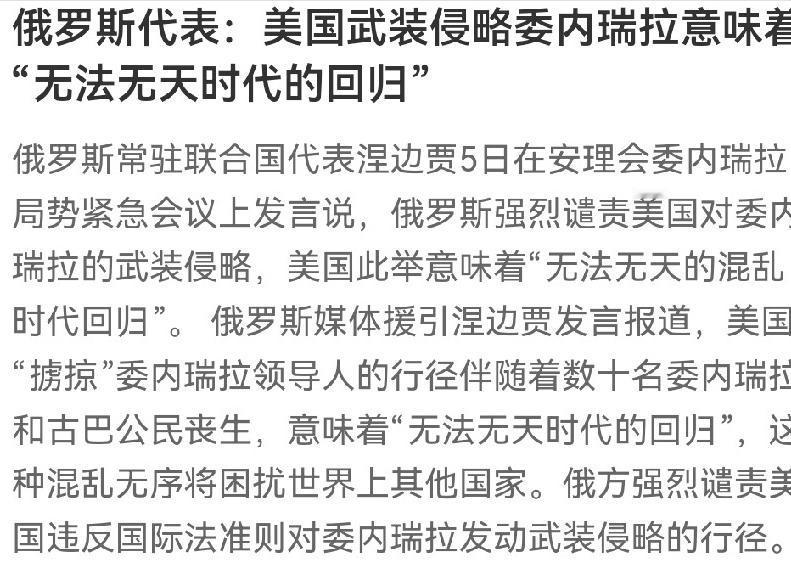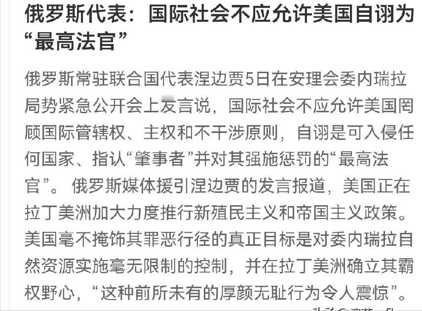 痛批!联合国关于美国侵略委内瑞拉的紧急会议结束了,看了一下俄罗斯代表的发言,那简直就是一个痛批美国,给予美帝国主义强烈谴责,一点面子也没给! 俄罗斯代表说这是 “无法无天时代的回归”,真是一点都不夸张。自二战结束后,美国就把自己当成了世界警察,更是把拉丁美洲视作自家 “后院”,想打就打、想骂就骂,完全不把国际法和别国主权放在眼里。 远的不说,1954 年,危地马拉想搞土地改革,动了美国联合果品公司的利益,美国就直接推翻了当地政府。 1973 年,智利总统阿连德要把铜矿国有化,维护本国利益,美国又策划政变,让这位民选总统死于非命;1989 年,美国干脆直接出兵入侵巴拿马,把该国总统诺列加抓走关押。 2003 年,美国以 “拥有大规模杀伤性武器” 为借口入侵伊拉克,打了多年战争,最后也没找到所谓的 “证据”,却让伊拉克陷入长期动荡,超过 80 万人失去生命,3800 多万人流离失所。 如今对委内瑞拉,美国故技重施,先给马杜罗扣上 “毒品恐怖主义” 的帽子,再动用武力抓捕,这套侵略剧本,美国已经演了无数次,早就烂熟于心。 美国自诩为 “最高法官”,动辄对别国指手画脚、定罪惩罚,可这世上哪有这样的 “法官”?《联合国宪章》明确规定,各国主权平等,不得对别国使用武力或武力威胁,联合国也不得干涉各国内政。 可美国根本不把这份国际大法放在眼里,自己想当 “法官”,想定谁的罪就定谁的罪,想打谁就打谁。 为了搞垮委内瑞拉,美国从 2017 年就开始实施大规模经济制裁,冻结委内瑞拉政府在美全部资产,封锁石油出口,把委内瑞拉踢出 SWIFT 结算系统,甚至冻结了英国央行里委内瑞拉的 31 吨黄金储备。 这些制裁不是针对某个政权,而是针对委内瑞拉全体人民,让这个原本富裕的资源大国一步步陷入绝境。 制裁带来的灾难,是每个委内瑞拉人都刻骨铭心的痛。联合国特别报告员的报告显示,制裁让委内瑞拉政府收入下降了 99%,公共服务近乎完全崩溃。 石油产业是委内瑞拉的经济支柱,制裁前每天能产近 250 万桶石油,后来跌到每天仅 30 万桶,出口收入从 2013 年的 730 亿美元暴跌至 2020 年的不足 50 亿美元,仅石油业就承受了 2320 亿美元的直接损失。 全国 GDP 五年间缩水 6420 亿美元,通货膨胀率一度突破 100 万 %,老百姓买个面包都要拿麻袋装钱,曾经的中产家庭也只能靠救济度日。 美国的霸权逻辑从来都没变过:谁不服我,我就制裁谁;制裁没用,我就扶持反对派;反对派不行,我就直接出兵。 2019 年,美国就不承认马杜罗政府的合法性,扶持反对派领袖瓜伊多自封 “临时总统”,给其提供资金和培训,唆使他发动政变,可这场闹剧最终以失败告终。 眼看代理人不成事,美国就亲自下场,2025 年授权中情局悬赏 5000 万美元抓捕马杜罗,在加勒比海进行 30 多年来最大规模军事部署,击沉 30 多艘船只,致死逾百人,一步步为军事入侵铺路。 美国前总统国家安全事务助理博尔顿都直言不讳,“政变是推进美国利益的必要途径”,这番话彻底撕下了美国 “民主”“自由” 的遮羞布,暴露了其帝国主义的本质。 可美国忘了,时代早就变了,不是它想为所欲为就能为所欲为的。这次美国侵略委内瑞拉,遭到了国际社会的强烈谴责。 巴西总统说美国开创了危险先例,墨西哥、哥伦比亚等六国联合声明反对美国的单边军事行动,拉共体召开特别峰会要求美国释放马杜罗、撤出军事力量,加纳、纳米比亚等国痛斥美国的殖民主义行径。 俄罗斯代表在联合国的发言,正是国际社会正义声音的集中体现,它告诉美国:你不是什么 “最高法官”,只是一个无视规则的霸凌者。 你所谓的 “秩序”,只是服务于自身霸权的丛林法则;这个世界不会容忍 “无法无天时代” 的回归,任何侵略行为都将遭到唾弃和反对。 美国驻联合国代表沃尔兹听着这些谴责,或许还能强装镇定,但内心必然充满心虚和恐慌。因为他清楚,美国的所作所为根本站不住脚,所谓的 “理由” 全是自欺欺人的谎言。 委内瑞拉人民没有屈服,国际社会没有沉默,越来越多的国家看清了美国霸权的真面目,也越来越团结地反抗这种霸凌行径。 历史已经无数次证明,凡是搞侵略、搞霸权的国家,最终都没有好下场。伊拉克战争、阿富汗战争让美国付出了巨大的人力物力代价,却没能实现其霸权野心,如今对委内瑞拉的侵略,只会让美国更加孤立,更快走向衰落。 “无法无天” 的霸权注定不能长久,自封的 “最高法官” 终将被钉在历史的耻辱柱上。美国应该明 白,每个国家的主权都不容侵犯,每个民族的选择都值得尊重,靠武力和制裁只能逞一时之快,永远赢不了人心。 如果美国执迷不悟,继续在霸权的道路上狂奔,等待它的必将是全世界的共同反对和历史的公正审判。