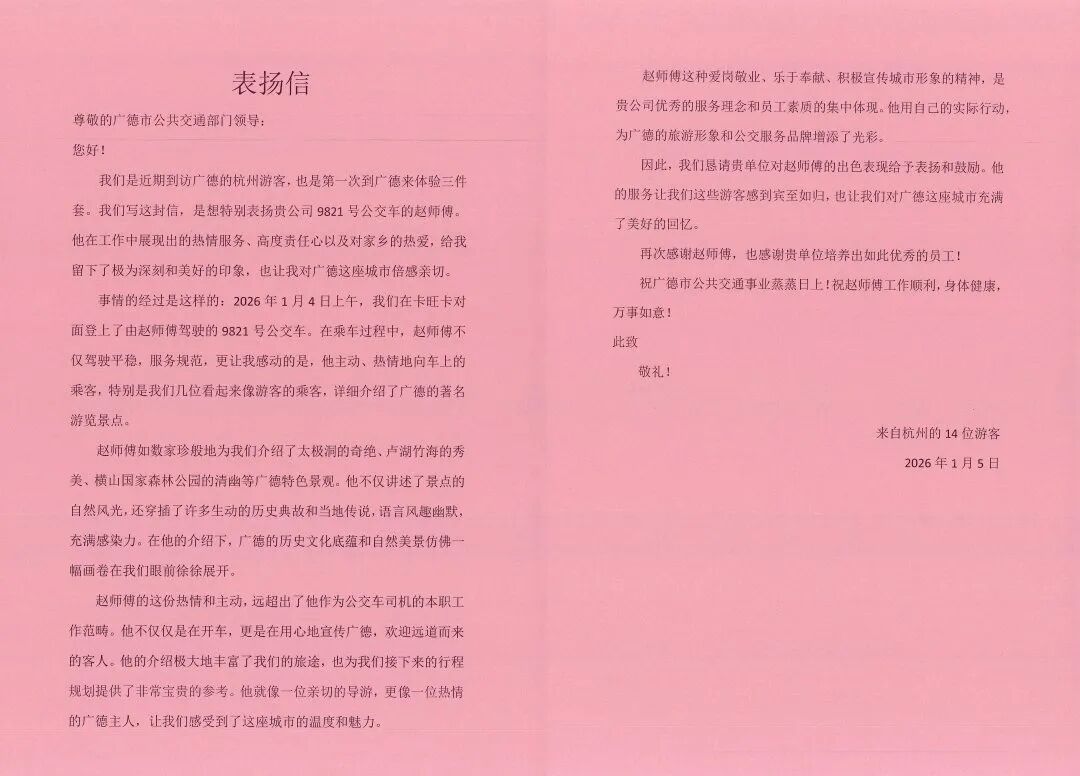 大皖新闻讯“赵师傅不仅驾驶平稳,服务规范,更让我感动的是,他主动、热情地向车上的乘客,特别是我们几位看起来像游客的乘客,详细介绍了广德的著名游览景点……”1月5日,广德市城乡公交公司收到了一封表扬信,落款是“来自杭州的14位游客”,信中所说的赵师傅,正是该公司公交车驾驶员赵守清。
