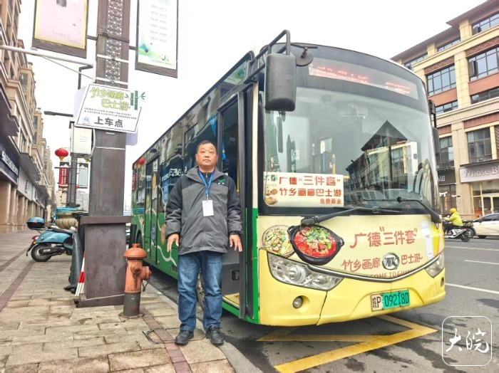 “广德三件套”爆火出圈后,广德市交通部门迅速推出“宠粉举措”,陆续推出了“三件套”城区巴士、“三件套”竹乡画廊巴士、咖啡巴士三大特色免费线路,保障市民与游客的顺畅出行。赵守清是“三件套”竹乡画廊巴士线路的公交司机。这是一条环线,从绥安路上火爆的卡旺卡、詹记桃酥门店出发,途经笄山、锁山桥、卢湖、甘溪、马术中心等广德著名的旅游打卡点,再回到绥安路。