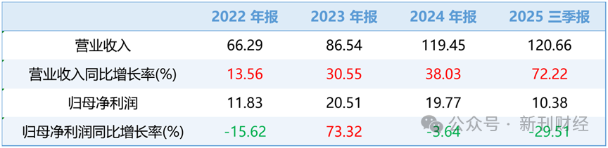 财报数据显示,公司在近几年实现快速营收增长,2022至2024年公司营收由约66.29亿元增至119.45亿元,2025年前三季度达到120.66亿元,甚至已超过2024年全年,但归母净利润却像过山车一样,在2023年实现超高速增长,却在2022、2024和2025三度下滑。