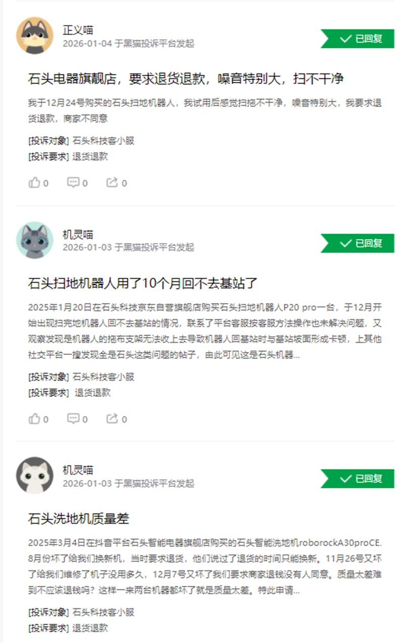 截至2016年1月5日,在黑猫投诉等平台上,有2140起针对石头科技的投诉,而完成率只有76%。关于产品清洁效果不佳、噪音大、有异味、无法回站等问题的投诉屡见不鲜。尤其是在其试图打造“高端品牌”的当下,产品定价动辄四五千元,但交付给用户的体验却未能完全匹配这一身价。