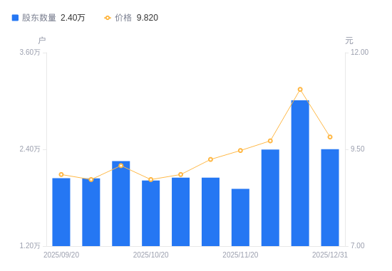 日期A股户数(户)流通A股户均持股数(股)户均持股市值(万元)2025-12-312401914904.4014.642025-12-103009511895.2913.142025-11-302397514931.7514.512025-11-201909318749.7417.762025-11-102049217469.6816.142025-10-312048617474.8015.472025-10-202014217773.2515.502025-10-102255115874.6314.412025-09-302039717551.0515.302025-09-202043617517.5515.50