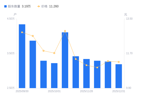 日期A股户数(户)流通A股户均持股数(股)户均持股市值(万元)2025-12-313190022161.8024.952025-12-193267021639.4724.452025-12-103290021488.1923.572025-11-283340016270.7018.042025-11-203420015890.1018.132025-11-104110013222.4217.022025-10-313220016877.0619.782025-10-203290016517.9819.562025-10-103870014042.4117.712025-09-304341112518.5216.02