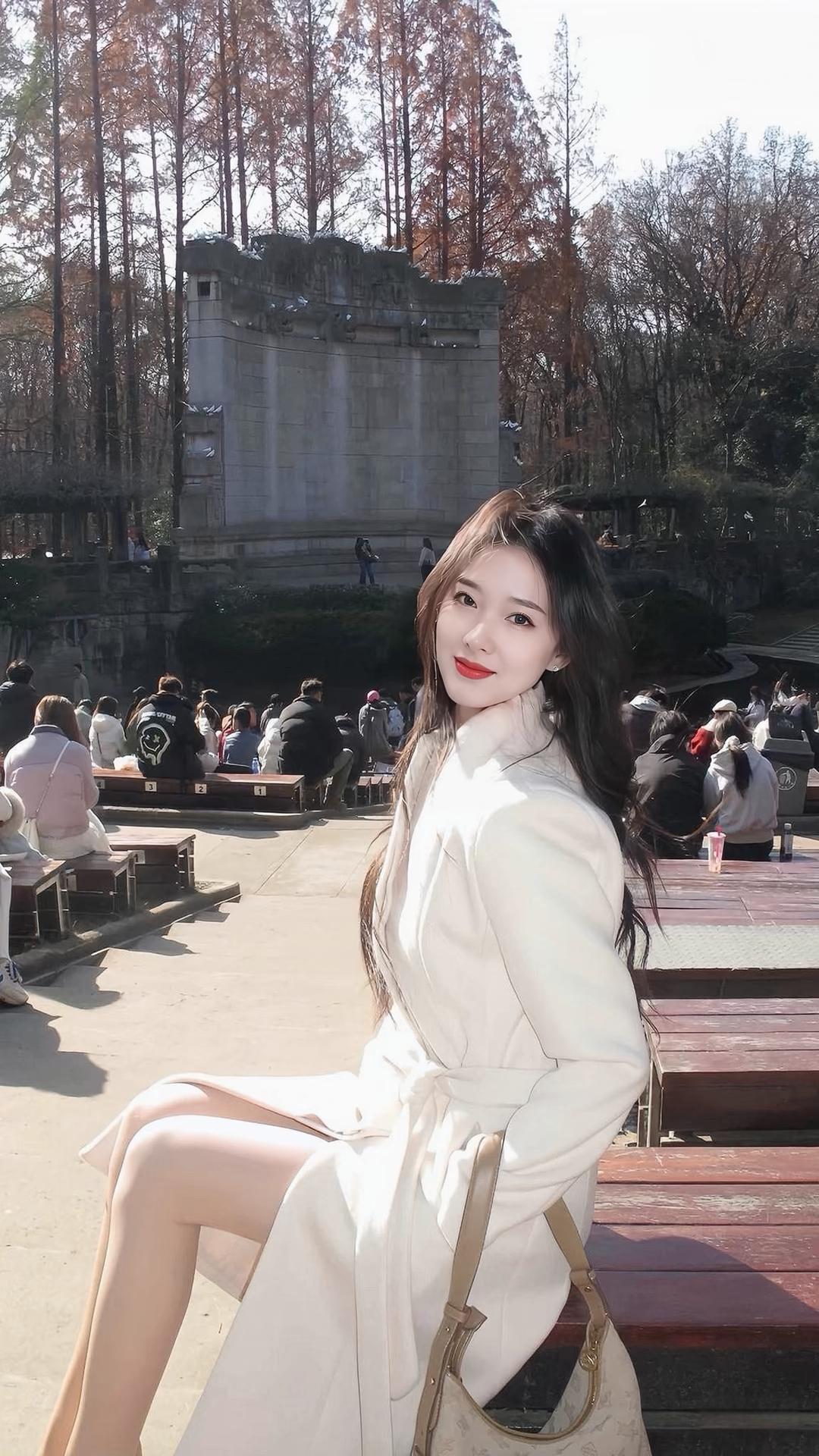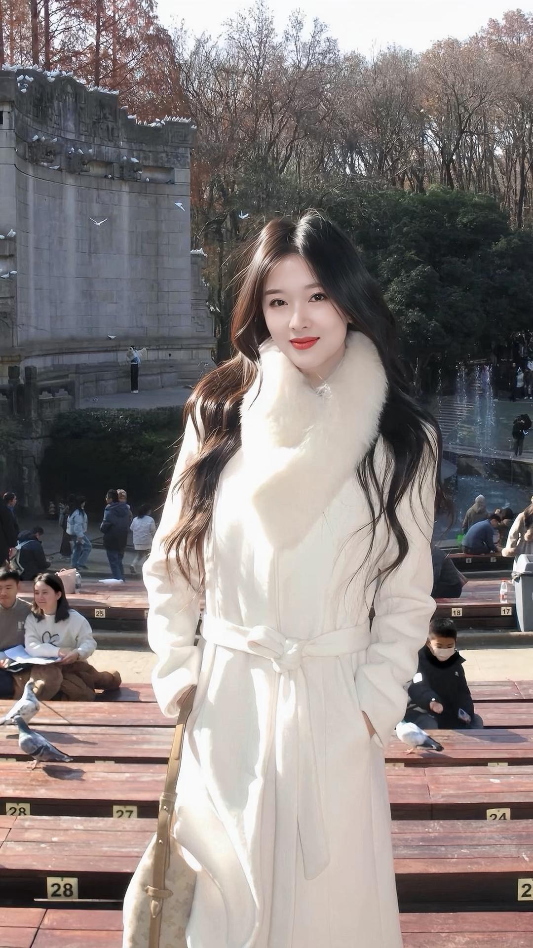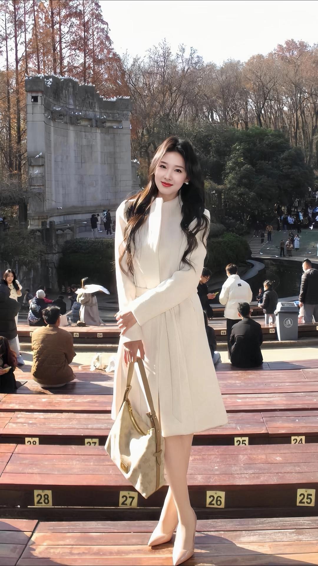白玉凝霜,人间绝色 阳光倾洒的刹那,天地间仿佛只为映衬她一人。一袭月白色长款大衣如云絮垂落,腰间系带轻轻一绾,勾勒出杨柳扶风的纤腰,衣摆随风轻扬,似银河泻地,将她的身姿衬得愈发修长。微卷的长发如黑色瀑布垂落肩头,在阳光下泛着丝绸般的光泽,发丝轻拂间,连空气都染上了清甜的香气。 她静坐于木质长椅上,双腿交叠,米色高跟鞋的鞋尖轻点地面,每寸肌肤都似凝脂,细腻得仿佛能掐出水来。红唇微启,笑意在唇角漾开,眼波流转间,如星辰坠入深海,勾魂摄魄。耳畔的耳饰在阳光下闪烁微光,与她白皙的颈项相映成趣,整个人仿佛从画中走出的仙子,不染尘埃。 背景中的人群与建筑都成了陪衬,连阳光都偏爱她,为她镀上一层金色光晕。她的一颦一笑,一举手一投足,都仿佛在演绎一场视觉盛宴。此刻,连风都屏住了呼吸,生怕惊扰了这幅人间绝色。
