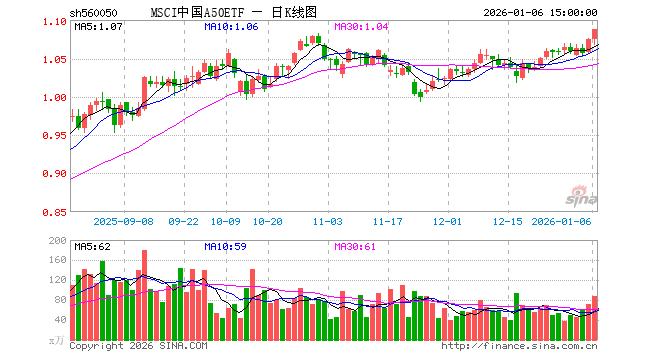 1月6日,MSCI中国A50ETF(560050)涨1.30%,成交额9429.97万元。当日份额减少500.00万份,最新份额为38.50亿份,近20个交易日份额减少5750.00万份。最新资产净值计算值为41.93亿元。