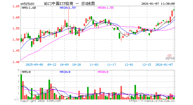 1月7日,截止午间收盘,MSCI中国ETF招商(515160)涨0.12%,报1.630元,成交额53.77万元。MSCI中国ETF招商(515160)重仓股方面,贵州茅台截止午盘跌0.13%,宁德时代跌0.87%,招商银行跌0.77%,工业富联跌0.67%,长江电力跌0.40%,紫金矿业跌1.22%,寒武纪跌0.80%,中国平安涨0.16%,比亚迪跌1.44%,海光信息跌1.60%。
