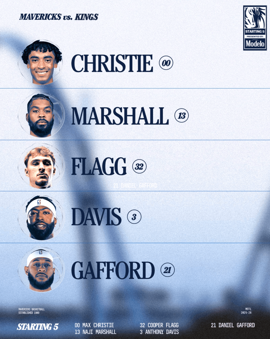 赛前,独行侠公布球队本场首发阵容:马克斯-克里斯蒂、纳吉-马绍尔、库珀-弗拉格、安东尼-戴维斯和丹尼尔-加福德。