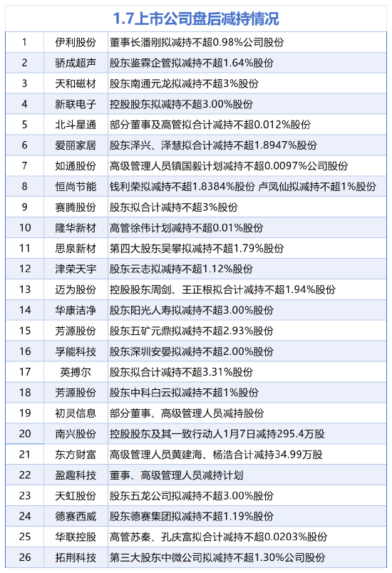 据统计,1月7日,盘后振芯科技、安孚科技、艾迪精密披露增持情况。包括伊利股份、骄成超声、天和磁材、新联电子、北斗星通、爱丽家居、恒尚节能、如通股份、隆华新材、赛腾股份、思泉新材、津荣天宇、华康洁净、迈为股份、芳源股份、孚能科技、英搏尔、芳源股份、初灵信息、南兴股份、东方财富、盈趣科技、天虹股份、德赛西威、华联控股、拓荆科技在内的26家A股上市公司披露减持情况。