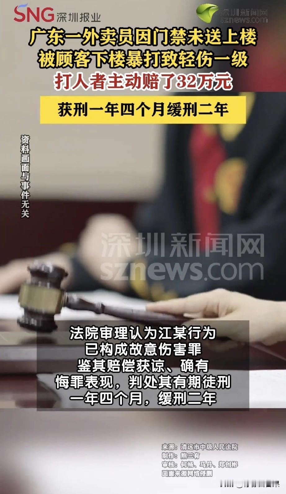 就因为门禁没让外卖送上楼,顾客居然把外卖员打成轻伤一级?”最近广东清远这事儿,真的看得人一整个大无语,本来一句话能说清的小事,最后闹到赔钱又坐牢,纯属给自己找罪受。 事情起因:一天晚上,外卖员邓师傅接了个清远清城某小区的单,到了小区大堂门口,因为门禁的规矩,根本没法上楼送,只能在楼下等顾客自己来取。结果顾客江某下楼后,不仅没理解这是小区规定,反而当场跟邓师傅吵了起来,吵着吵着江某直接上头了,动手把邓师傅揍了一顿,最后把人打成了轻伤一级。 后来这案子被清远市中级人民法院审了,江某估计是怕了,主动赔了邓师傅32万块钱,想要求得谅解。但法律可不是赔钱就能了事的,最后法院判了他有期徒刑一年四个月,缓刑二年。 说实话,我看完这事儿真觉得江某太冲动了。门禁是小区的规定,又不是外卖员故意不送,好好说一句“那我下来拿就行”,啥事都没有。就因为这点小事动手打人,不仅让邓师傅平白受了伤、遭了罪,自己还得掏32万赔偿,还背上了刑事案底,以后生活、工作说不定都受影响,这笔账怎么算都亏到姥姥家了。 而且外卖员风里来雨里去的,挣的都是辛苦钱,凭劳动吃饭的人,难道不该被尊重吗?生活里谁还遇不到点小麻烦,多一分理解,少一分火气,用嘴沟通远比用拳头解决问题靠谱多了。这事儿也算是给所有人提了个醒:遇事别上头,冲动是真的会付出惨痛代价的!