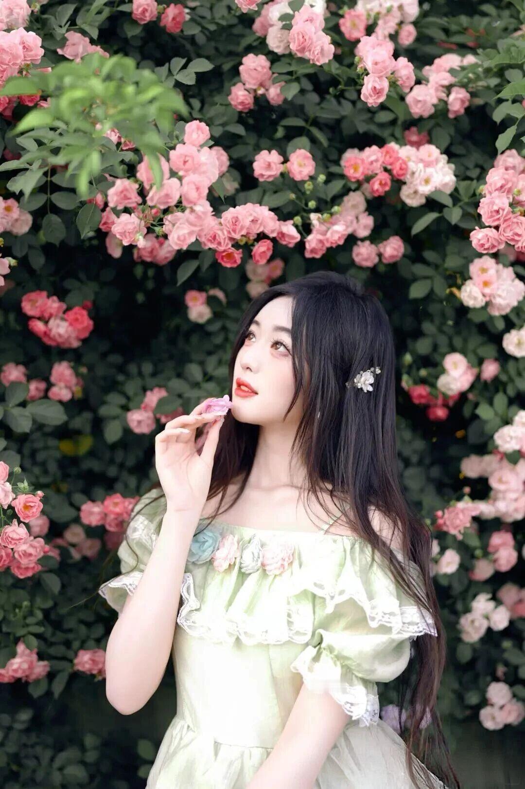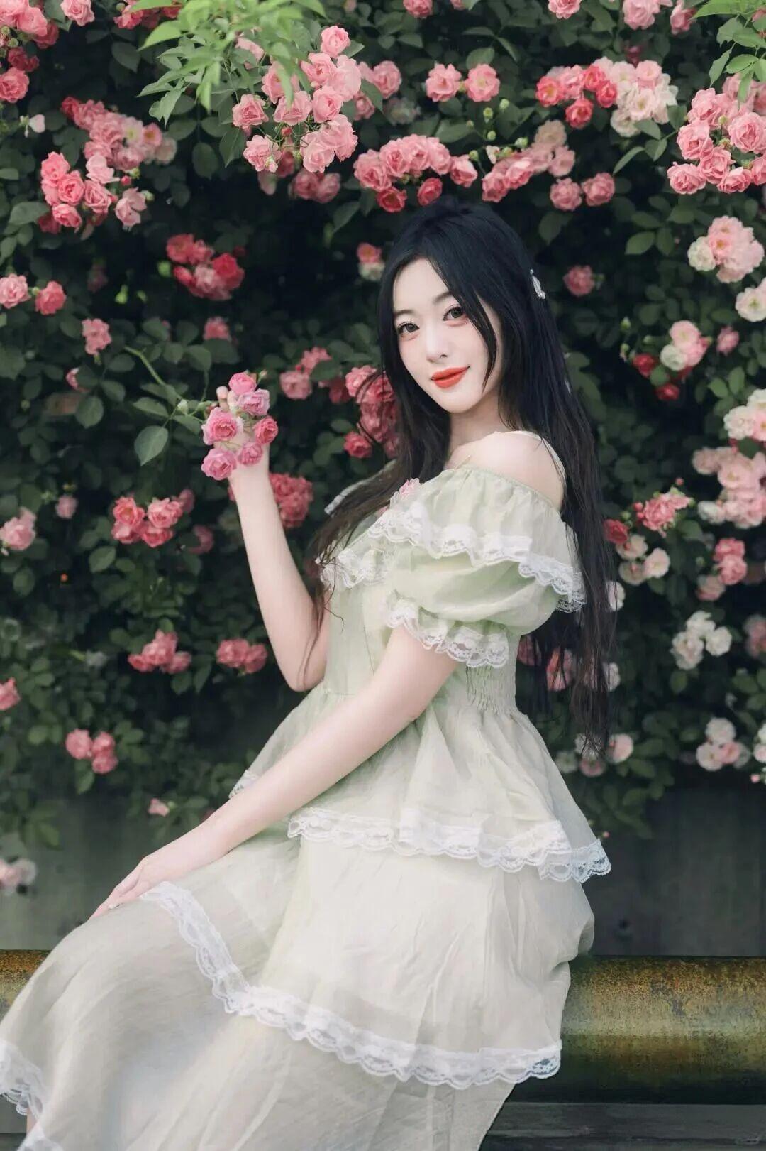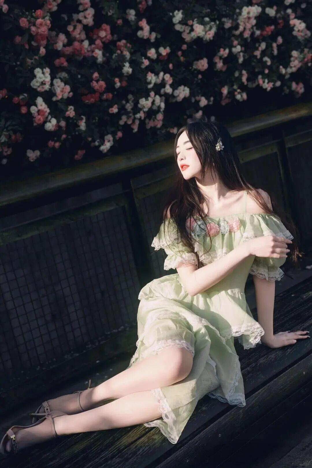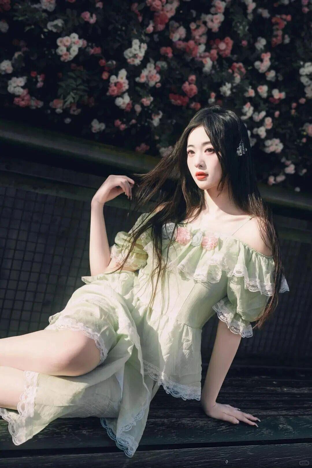 她不是凡间的女子,分明是花神在人间的具象化身!身着薄荷绿蕾丝花边连衣裙的仙子,裙料如春日最柔的柳絮,轻裹着她曼妙的身姿,一字肩裁剪勾勒出天鹅颈与锁骨的黄金分割线,每一寸肌肤都在花影里泛着珍珠母贝的光泽。裙摆层层叠叠如蛋糕般蓬松,白色蕾丝花边是月光织就的云朵,走动时仿佛有清风在低吟,百花在争艳。 她乌黑的长发如瀑布般垂落,发梢微卷处藏着整个春天的温柔。眼眸低垂时,睫毛如蝶翼般颤动,盛着秋水般的温柔;抬眸瞬间,瞳孔里映出的光芒,比花丛所有彩蝶更耀眼。耳畔的水钻耳坠折射着钻石般的光芒,发间那朵白色蝴蝶结发饰,竟是从天上偷摘的云朵,只为衬托她皎月般的容颜。 她站在花墙前,指尖轻触粉色玫瑰,那姿态仿佛在拨动命运的琴弦。连蜜蜂都忘记了采蜜,蝴蝶都忘记了飞舞,生怕惊扰了这幅流动的油画。阳光透过花瓣洒下金色的光栅,为她镀上圣洁的光晕,连空气中漂浮的微尘都在为她起舞。 这便是花神的觉醒,浪漫与优雅的完美化身!她不是在穿衣,而是在演绎一场关于美的盛宴,每一个动作都是诗,每一道目光都是画,这样的绝代佳人,简直是让凡人跪拜的时尚神谕!